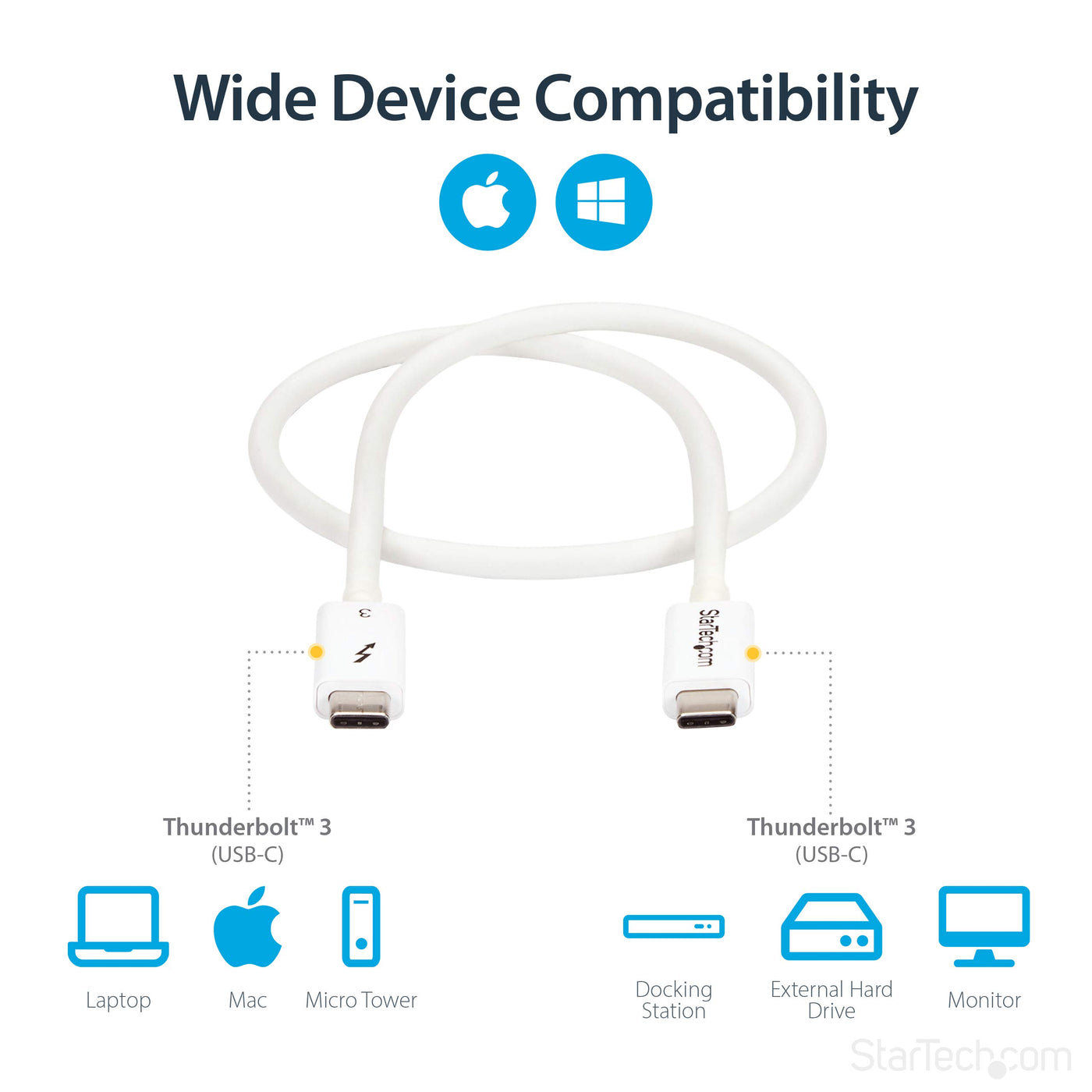 This White Thunderbolt 3 (40Gbps) Cable Lets You Connect To Any Thunderbolt 3 Port (Usb Type C) To Deliver Video And Data To Your Thunderbolt, Usb And Displayport Devices Plus, The Cable Can Provide Power For Charging Your Devices, And You Can Link Up To Six Tb3 Devices As Part Of A Daisy-Chained Connection Transfer A 4K Movie In Seconds And Complete Backups In Minutes With This Thunderbolt 3 Usb C Cable (Male To Male), Supporting Data Transfer Rates Of 40Gbps When Connected To A Thunderbolt 3 Device You Can Transfer Photo And Video Files At Four Times The Speed Of A Usb 31 (10Gbps) Cable The Tb3 Cable Cord Supports Full 4K 60Hz Or 5K 60Hz Video The Cable Also Supports Displayport 12 And Is Compatible With Existing Displayport Displays Its Perfect For Connecting Your Docking Station Or Laptop To A Monitor With Astonishing Resolution, Contrast, And Color Depth For Amazing Detail The Thunderbolt 3 Type C Cable Delivers Up To 100W Of Power For Charging A Thunderbolt 3 Laptop Or Powering A Display, And 15W For Bus-Powered Devices Such As A Hard Drive Enclosure The Tb3 Cable Gives You An Easy Way To Bridge Multiple Thunderbolt 3 Usb C Enabled Laptops For Peer-To-Peer 10Gbe Networking Its Perfect For Setting Up Small Workgroups And Sharing Peripherals Such As Printers And Storage You Can Also Connect Two Thunderbolt 3 Laptops Together, For Easy Pc Migrations
