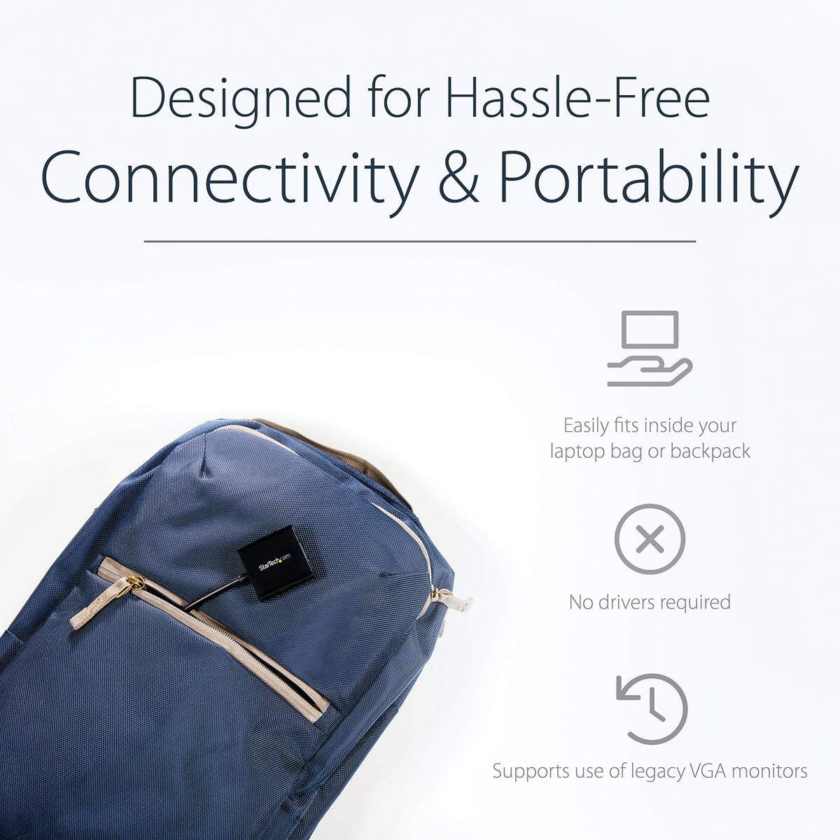 Q: Is the StarTech HDMI to VGA adapter portable for travel?A: Yes, the adapter is designed with portability in mind. It is ultra-lightweight and compact, making it easy to fit into your laptop bag. It does not require an external power source, making it convenient for IT professionals on the go.