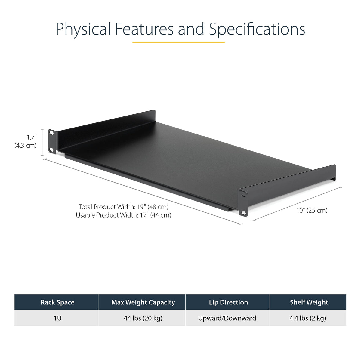 The 1U Vented Server Rack Mount Shelf Is 10In Deep And Lets You Add A Compact, 1U Shelf To Almost Any Standard 19 Inch Eia-310 Compliant Server Rack Or Cabinet With Front Mount Options. Its Versatile Design Ensures It Works Great For All Your Computer, Av, Network And Data Equipment Needs; Perfect For It And Business Professional Alike. Constructed Using Spcc Commercial Grade Cold-Rolled Steel, This Durable Fixed Rack Shelf Can Hold Up To 44 Lb / 20 Kg Of Equipment - A Perfect Solution For Storing Small, Non Rack Mount Equipment, Tools, Peripherals Or Accessories In Your Rack Or Cabinet To Keep Them Readily Accessible. The Rugged Steel Construction Holds Up To Even The Harshest Industrial Environments, Helping To Keep Your Equipment Safe. This 1U Fixed Rack Tray Shelf Is Backed By A Startech..
