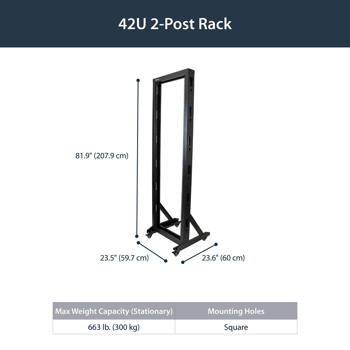 Store Your Server, Network And Telecommunications Equipment In This Sturdy 42U Mobile Open Frame Network Rack With Wheels. With A 2-Post Design, The Rack Saves Floor Space And Its Dual-Post, Open-Depth Design Makes It Broadly Compatible With Longer Equipment. The 2 Post Rack Features Four Swiveling Casters, So You Can Easily Move It Around In Your Server Room, Office Or Studio. It'S Easy To Reposition Or Relocate The Mobile Rack In Order To Connect Your Rack-Mounted Equipment To Other Devices Throughout Your Workspace. The Durable Dual-Post Server Rack Is Made Of Heavy-Gauge Steel, Instead Of Aluminum, To Ensure A Stable Installation Platform. This 2-Post Rack Supports A Static Loading Capacity Of Up To 600Lb. (272Kg) And Is Compliant With Several Industry Rack Standards (Eia/Eca-310, Iec 60297, Din 41494), To Provide A Stable Platform That Eliminates The Need For Concrete Mounting Kits. You Can Easily Mount Your Ansi/Eia Rs-310-D Compliant Network Equipment To The Rack Without Using Additional Hardware. It Features Square Mounting Holes On The Frame And A Universal Design That'S Compatible With Most Rack Equipment. Use In Your Server Room Or Any Location Where Telecommunication And Networking Equipment Needs To Be Housed.