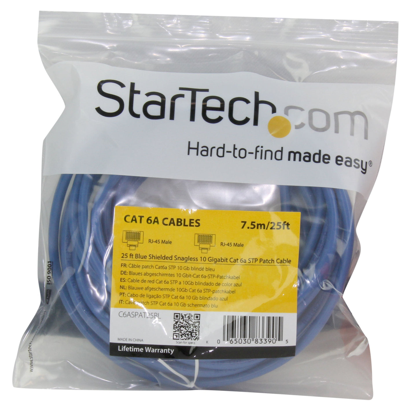 This 25-Foot Cat6A Cable Meets Or Exceeds All Category 6A Cable Specifications To Ensure Reliable 10Gb Network Connections The Cable Is Shielded To Protect Your Network Against Electromagnetic Interference (Emirfi) And System Noise, Providing The Perfect Solution For Fast And Safe Network Connectionsreliable Cat6A 10 Gigabit Connectionseach Cable Is Tested For Up To 500 Mhz Frequency And Is More Than Suitable For 10Gbase-T Ethernet Networksconstructed With 100% Copper And Foil-Shielded, Twisted-Pair Wiring, This Cable Was Built For Quality Performance The Cable Is Designed To Keep The Data Signals Traveling Through Your Network Free From Interference And Is Perfect In Environments That Are Prone To Large Amount Of Emithe 50-Micron Gold Connectors Deliver Optimum Conductivity And Eliminate Signal Loss Due To Oxidation Or Corrosionsecured Network Connectionsfor Easier Cable Runs, The Snagless Connectors Protect The Rj45 Clips During Installation, Making Them Less Likely To Snag Or Break This Ensures A Sturdy Connection By Preventing The Cable From Becoming Loose From The Portplus, The Molded Boots Offer Strain Relief That Stops The Rj45 Connector Termination Points From Bending At Sharp Angles, Which Reduces The Risk Of Damage To The Cable That Could Decrease Network Performancethe C6Aspat25Bl Is Backed By Startech