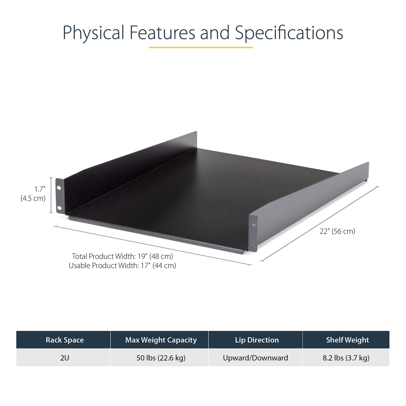 The Cabshelf22 2U 22In Depth Fixed Rack Mount Shelf Lets You Add A Compact, 2U Shelf To Virtually Any Standard 19-Inch Server Rack Or Cabinet With Front Mount Options This Taa Compliant Product Adheres To The Requirements Of The Usa Federal Trade Agreements Act (Taa), Allowing Government Gsa Schedule Purchases Startech High-Quality Rack Shelves Are Designed To Withstand Harsh Work Environments With Ease Constructed Using Spcc Commercial Grade Cold-Rolled Steel, This Durable Fixed Rack Shelf Can Hold Up To 22Kg (50Lbs) Of Equipment - A Perfect Solution For Storing Small, Non-Rackmount Equipment, Tools, Peripherals Or Accessories In Your Rack To Keep Them Readily Accessible Backed By A Startech Lifetime Warranty 2U Fixed Rackmount Shelf Fits All Standard 19 Server Racks Taa Compliant For Gsa Schedule Purchases Holds Up To 22Kg (50Lbs) Spcc 16Mm Cold-Rolled Steel Construction Front Mount Design Applications Supply Additional Storage Space For Mission Critical Hardware And Non-Rack Mount Equipment For Use With All 19 Wide Server Racks And Cabinets Advantage Universal 19 Rack Design Makes It Simple To Add A Storage Shelf To Almost Any Rack Or Cabinet Durable Steel Construction Holds Up To Even The Harshest Industrial Environments