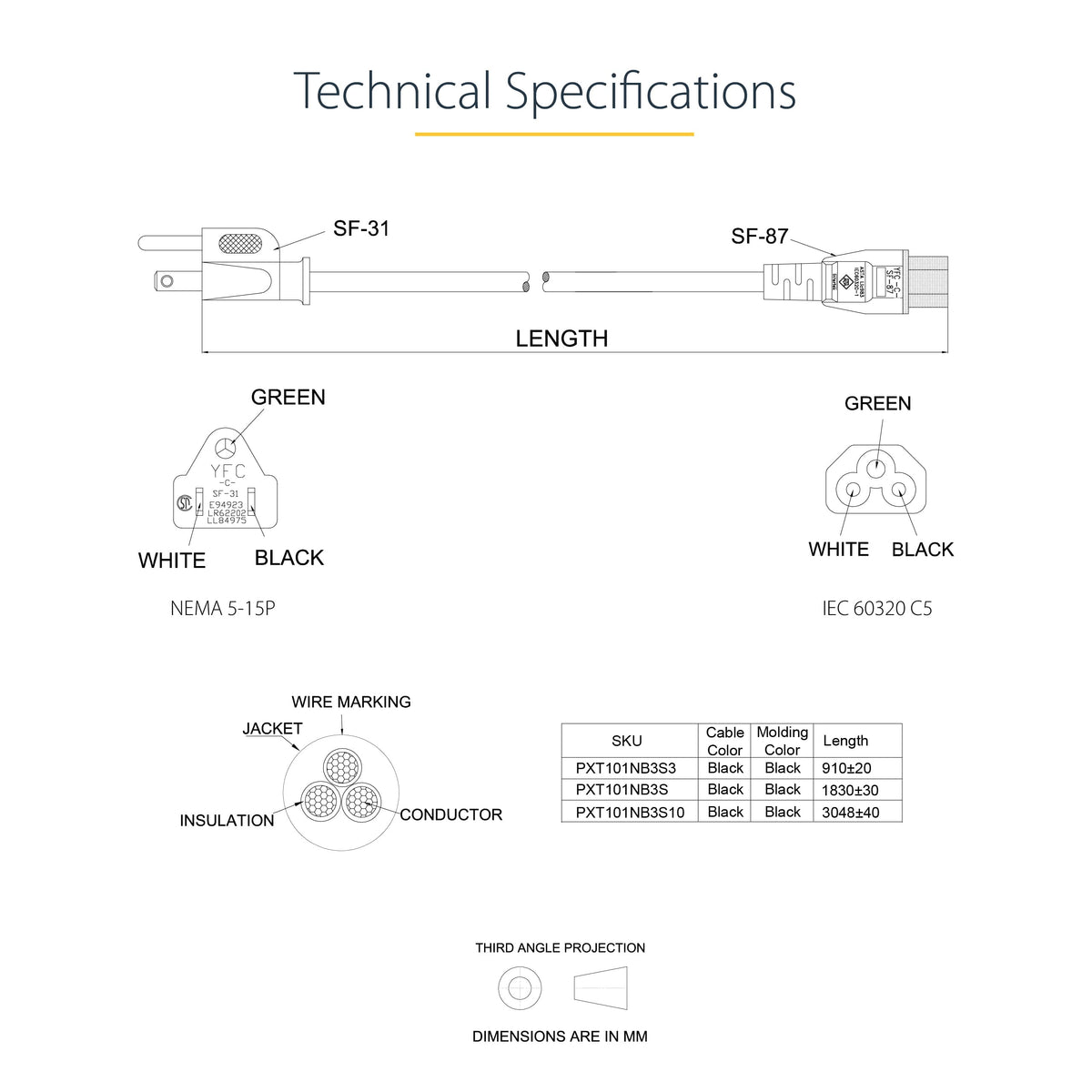 The Pxt101Nb3S3 3 Ft. 3-Slot Laptop Power Cord Features One Nema 5-15P And One C5 Connector - A Suitable Replacement Notebook Power Cord Or Spare Power Cord For Your Hp, Toshiba Or Other Compatible Laptop. Designed For Durability And Dependability..