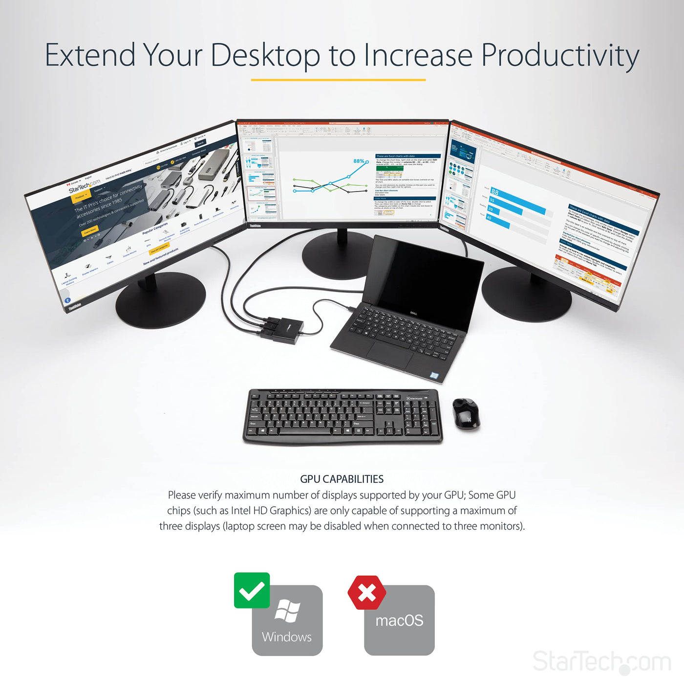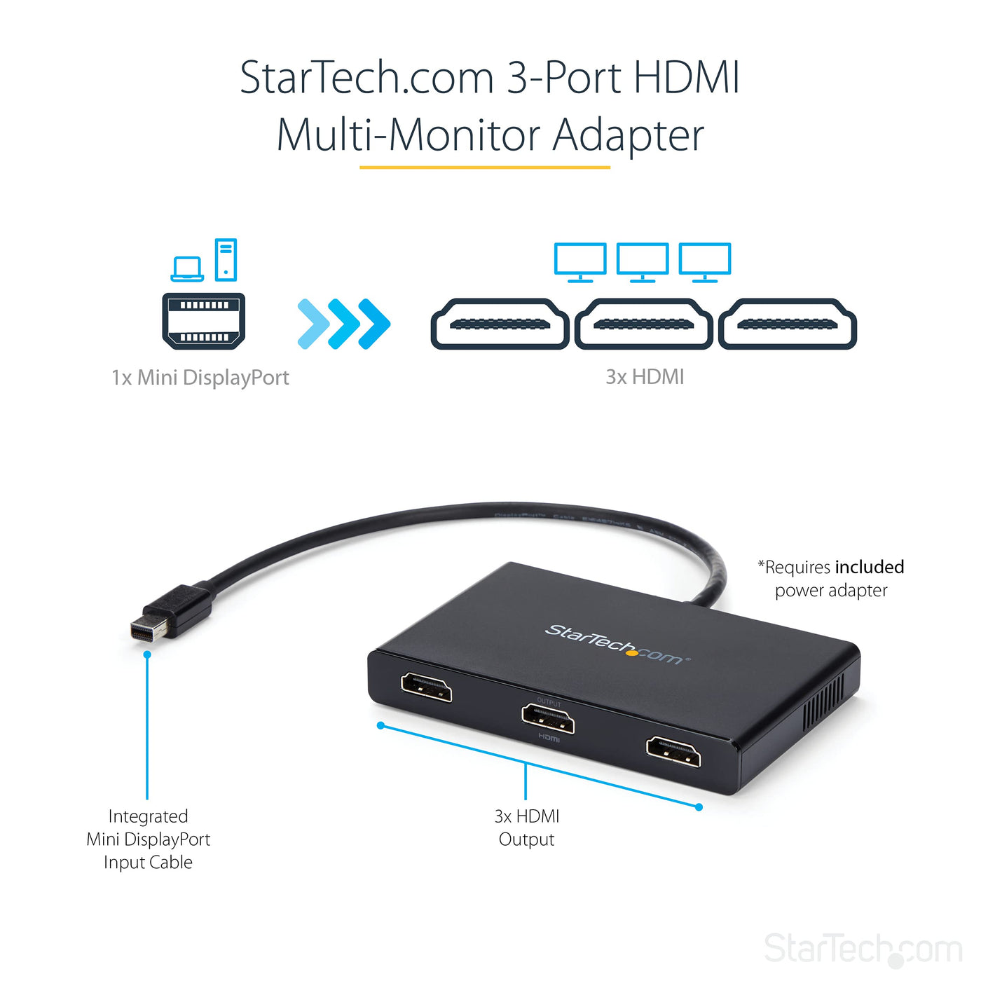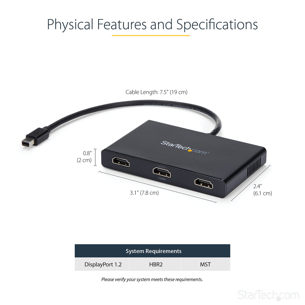 Multi-Tasking Made Easy This Mini Displayport Mst Hub Lets You Connect 3 Hdmi Monitors To Your Mdp Windows Device, Conveniently Helping You To Increase And Maximize Your Productivity. With Devices Becoming More Portable Than Ever, You Are Limited To Fewer Video Outputs And Confined To Your Small Integrated Screen. This Mst Hub Solves That Problem By Enabling You To Connect 3 Separate Monitors Or Displays To Your Mini Dp Computer, Making Multi-Tasking Much Easier. Using This 4K Hdmi Splitter Hub, You Can Mirror Your Display Onto Multiple Monitors Or Stream Independent Content To Each Display Which Makes It The Ideal Accessory For Travel Or Hot-Desking Environments. Astonishing Picture Quality Mst Technology Uses Your Existing Video Card To Minimize The Use Of System Resources While Delivering Uhd 4K Resolutions For Up To Two Monitors Simultaneously. Plus, Because The Mdp Mst Hub Can Output Hd 1080P On Triple Monitors, Its Perfect For All High-Resolution Applications Such As Graphic Design And Medical Imaging. Broad Capabilities This Mini Displayport To Hdmi Splitter Lets You Create A Functional And Easy To Use Multi Monitor Workstation. Mst Works On Any Windows Device That Supports Displayport 1.2, Such As Models Of The Lenovo Think Pad And Microsoft Surface. When Connected To Earlier Revisions Of Displayport, Such As Dp 1.1 This Mst Hub Acts As A Video Splitter. This Triple Monitor Mini Displayport Mst Hub Is Backed By A Startech. And Free Lifetime Technical Support.