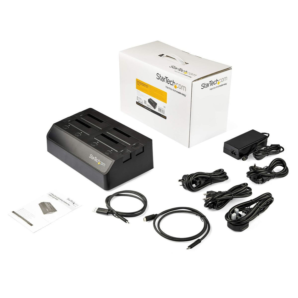 Q: Does the docking station require additional drivers or software to function?A: No, the StarTech.com 4-Bay Docking Station is OS independent and does not require any additional drivers or software for use, making it easy to set up.