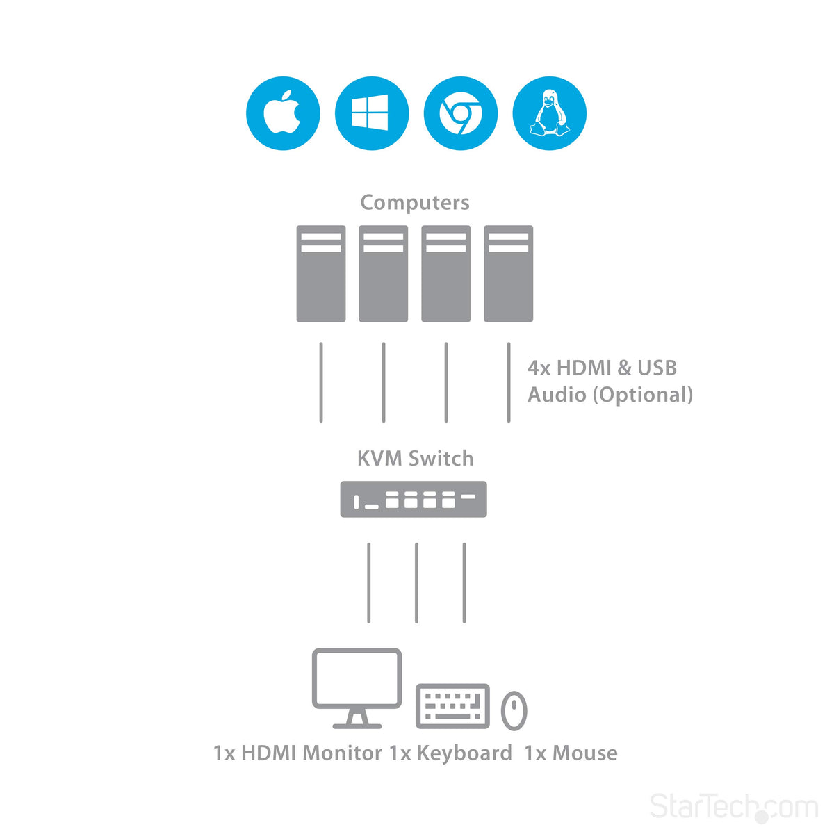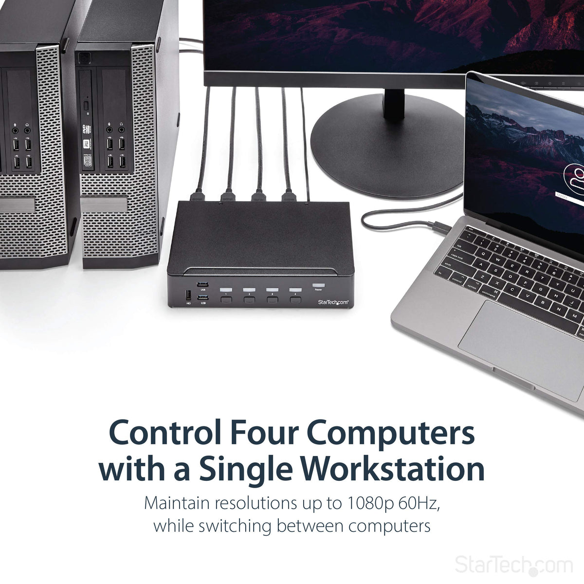 Q: What is a KVM switch and how does it work?A: A KVM switch allows you to control multiple computers from a single monitor, keyboard, and mouse. The StarTech.com 4 Port HDMI KVM Switch lets you seamlessly switch between four HDMI computers, enabling efficient management and workspace optimization.