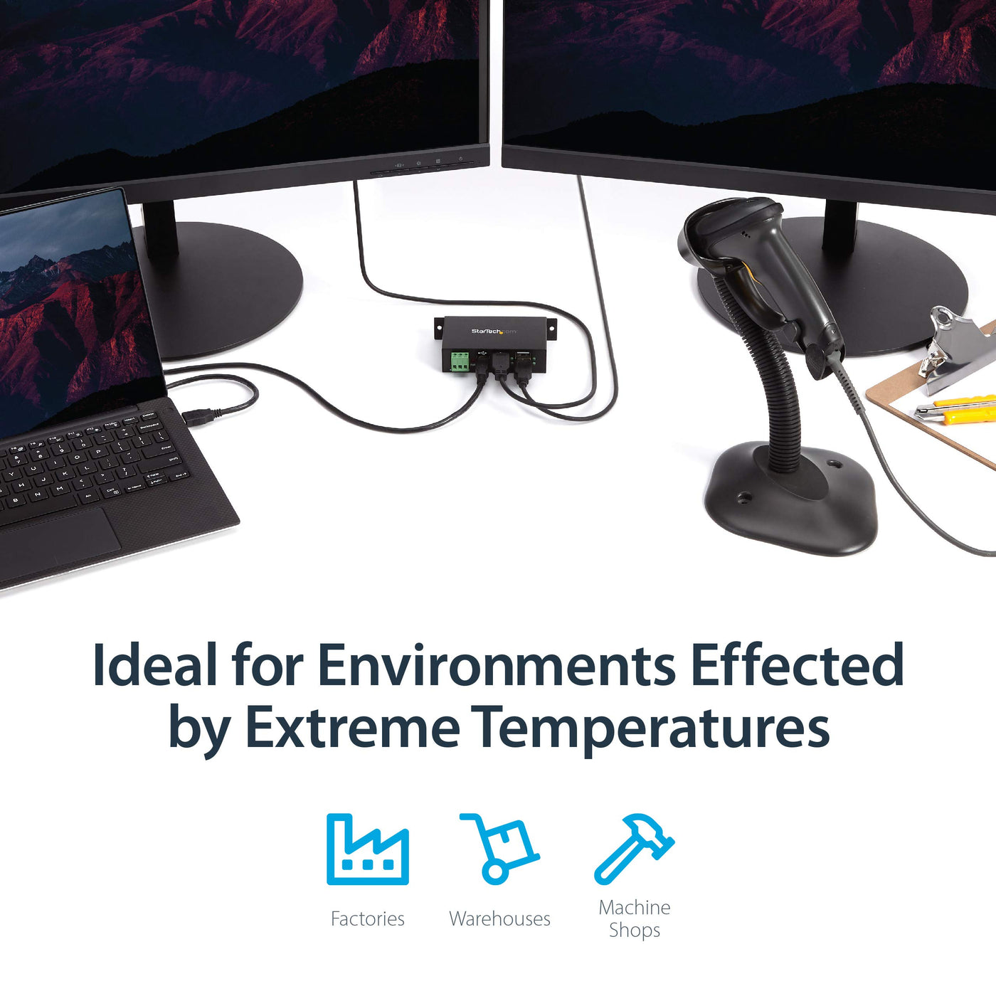 Q: What are the environmental protections offered by the StarTech.com USB hub?A: This industrial USB hub is designed for harsh environments, supporting an operating temperature range of 0°C to 55°C and offering ESD protection to each USB port to prevent damage to connected devices.
