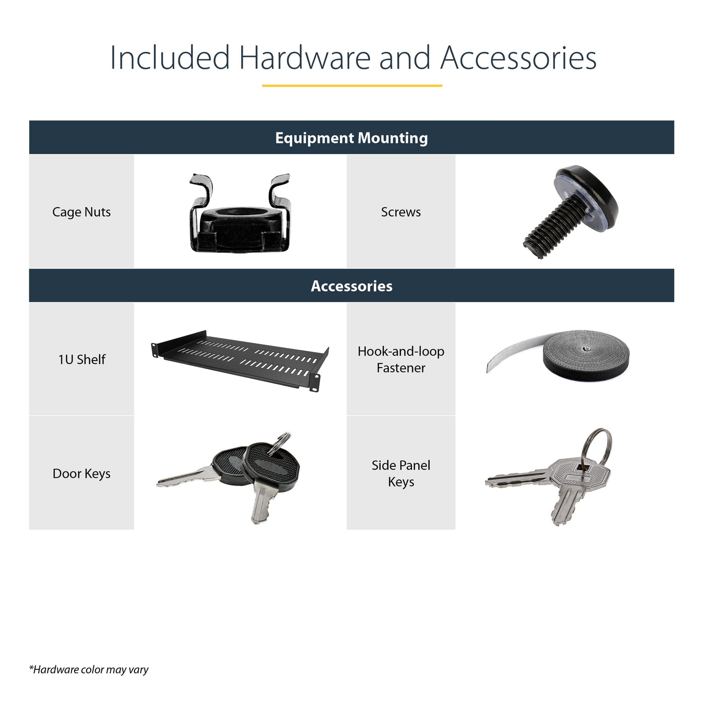 Q: What safety features does the cabinet have?A: The cabinet includes secure key locks on the front and side panels. This ensures that your equipment is protected from unauthorized access.