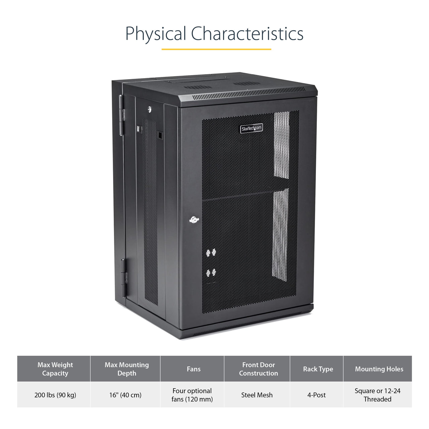 Product Technical Specifications:Warranty Information :Warranty: 5 Yearshardware :Fan Options: Four Optional Fans: 120 Mmframe Type: Enclosed Cabinetfront Door Construction: Steel Meshfront Door Features: Secure Key Lock With Reversible And Removable Front Doorindustry Standards: Eia/Eca-310-Emounting Hole Types: Square (For Cage Nut) Or Threaded Holemounting Rail Profile: L-Shaperack Type: 4-Postrear Door Construction: Steelside Panel Construction: Steel Meshside Panel Features: Secure Key Lock With Removable Side Panelsgrounding Lug(S): Yesships Fully Assembled: Yesu-Markings: Yeswall-Mountable With Rear Access Hinges: Yesu Height: 18Uwall Mountable: Yesperformance :Weight Capacity: 198.9 Lbs. (90Kg)Maximum Mounting Depth: 16 Inches (40.6 Cm)Minimum Mounting Depth:2.4 Inches (6 Cm)Special Note: Includes Cabshelfv1U And 2 Pairs Of Keys