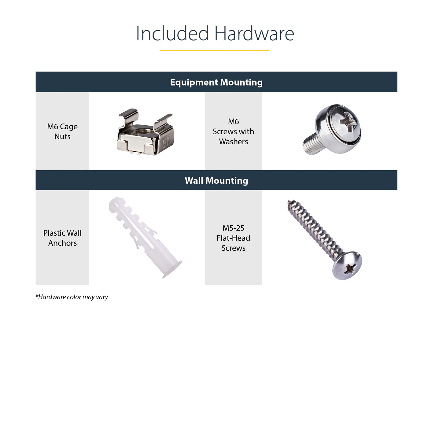 Q: How do I install the StarTech.com wall mount rack?A: The wall mount rack comes fully assembled and includes M6 screws and cage nuts, making installation straightforward. It is designed to be mounted onto 16-inch studs, ensuring secure anchoring.