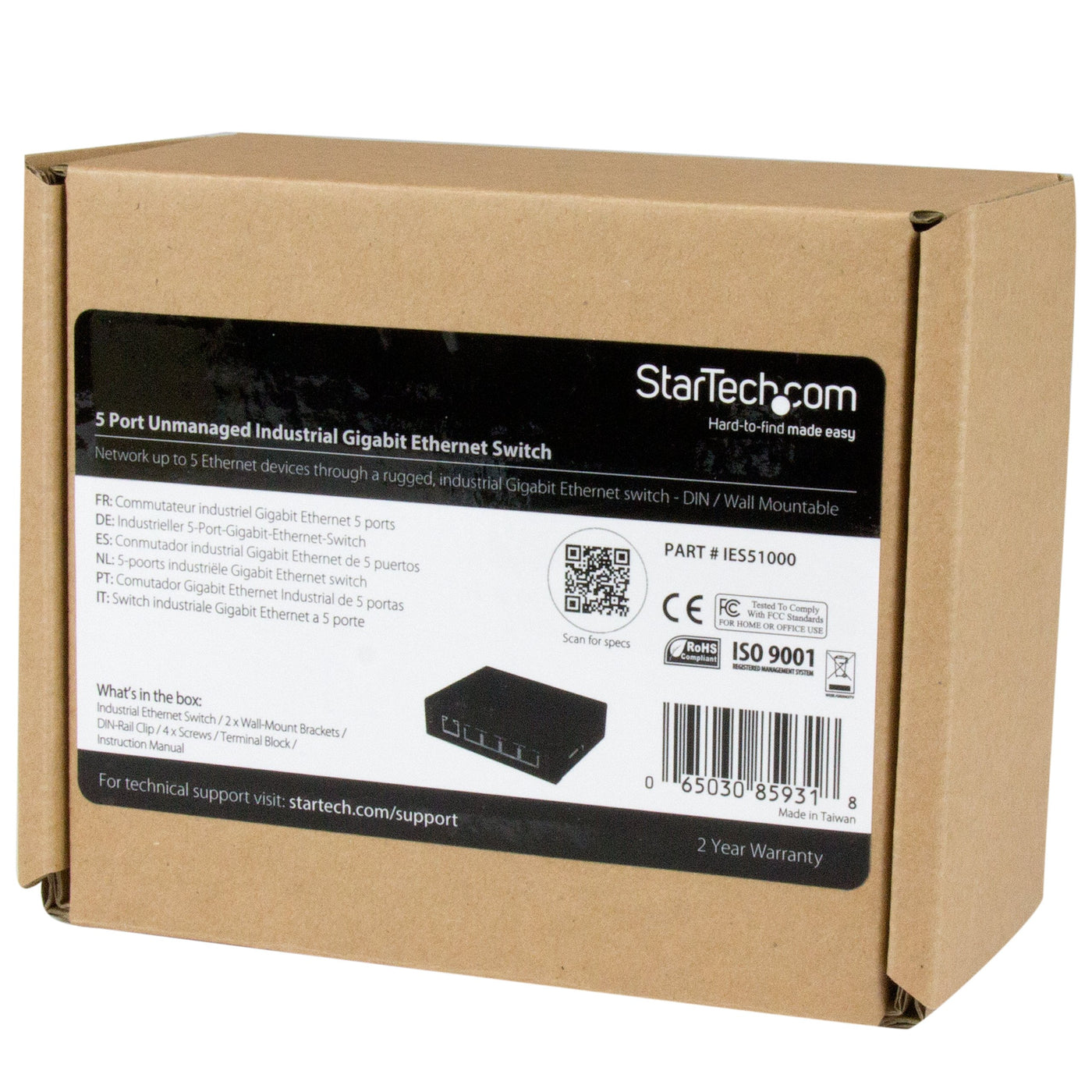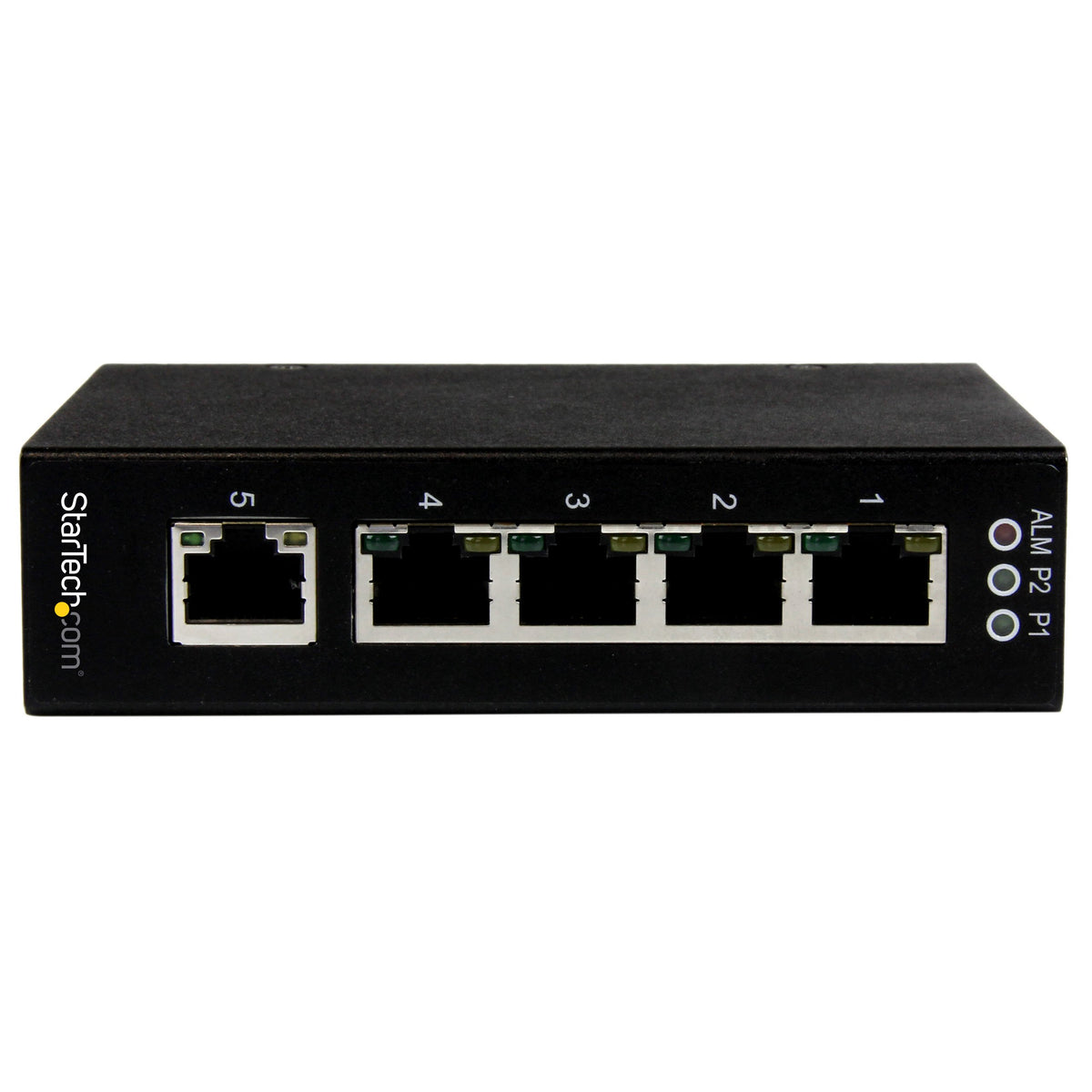 5 101001000 Mbps Unmanaged Rj45 Ethernet Ports Ip30-Rated Din Rail And Wall-Mountable Metal Enclosure Wide-Range Redundant Power Via Two 12-58V Dc Terminal Block Inputs, With Alarm Relay Overcurrent And Reverse Polarity Protection Extended Operating Temperature Range (-40Ac To 75Ac) Speed Duplex Auto-Negotiation And Auto-Mdix Detection On Each Port Up To 9K Jumbo Frame Support Ieee 8023Az Energy-Efficient Ethernet Supports Ieee 8023X Flow Control And Back-Pressure The Ies51000 5-Port Industrial Ethernet Switch Offers 5 Gigabit Ethernet Ports In A Compact, Ip30-Rated Metal Enclosure, Making It The Ideal Network Solution For Harsh Industrial Environments Such As Factory Floors, Warehouses Or Large Junction Boxes Quickly Connect Your Network Devices With Little To No Configuration This Unmanaged Industrial Network Switch Supports 101001000 Mbps Transfer Speeds, Fullhalf-Duplex Auto-Negotiation, Jumbo Frames And Auto Mdimdix, Which Helps To Eliminate The Hassle Of Troubleshooting Mis-Matched Speed And Duplex Settings Providing Seamless Operation In The Event Of Power Dips Or Failures, The Switch Features Redundant 12-58V Dc Terminal Block Power Inputs To Help Prevent Unnecessary Downtime When Used With Two Power Sources, The Switch Also Supports Alarm Relay Contacts That You Can Wire To Your Existing Alarm Circuit To Notify You Instantly When A Power Disruption Occurs For Easy Installation And Dependable Performance In Harsh Environments, The Switch Can Be Din Rail Or Wall Mounted And Features A Compact, Ip30-Rated Enclosure With An Extended Operating Temperature Range (-40Ac To 75Ac) Backed By A Startechcom 2-Year Warranty And Free Lifetime Technical Support Ideal For Industrial Applications Such As Warehouses And Junction Boxes Without Temperature Control Suitable For Adding Gigabit Ethernet On Factory Manufacturing Floors Great For Adding Small Workgroups To An Existing Network Seamless Performance Even In Harsh Industrial Conditions, With An Extended Temperature Range And An Ip30-Rated Enclosure Maintain Device Operation During Power Disruptions, With Redundant Power Inputs Install The Switch Exactly Where You Need It, Using The Included Din Rail & Wall-Mount Brackets Specifications Warranty Information Warranty 2 Years Connector(S) 5 - Connector Type(S) Rj-45 1 - Connector Type(S) Terminal Block (6 Wire) Environmental Operating Temperature -40Ac To 75Ac (-40Af To 167Af) Storage Temperature -40Ac To 85Ac (-40Af To 185Af) Humidity 595% Rh (Non-Condensing) Hardware Ports 5 Interface Rj45 (Gigabit Ethernet) Industry Standards Ieee 8023 10Base-T, Ieee 8023U 100Base-Tx, Ieee 8023Ab 1000Base-Tx Ieee 8021P Qos, Ieee 8023Az Energy-Efficient Ethernet, Ieee 8023Ad Link Aggregation Ip30 (Enclosure) Indicators 1 - Led Indicators P1 (Power) Indicator P2 (Power) Indicator Alm (Alarm) Indicator 5 - Led Indicators Link Act Speed Indicator Packaging Information Package Height 33 In 830 Mm] Package Length 69 In 176 Cm] Shipping (Package) Weight 185 Oz 5230 G] Package Width 55 In 139 Cm] Performance Maximum Data Transfer Rate 2 Gbps (Full-Duplex) Maximum Cable Length 3280 Ft 100 M] Buffer Size 128 Kb Flow Control Half-Duplex Back-Pressure And Ieee8023X Full-Duplex Compatible Networks 101001000 Mbps Auto Mdix Yes Full Duplex Support Yes Jumbo Frame Support 9K Max Switching Architecture Store-And-Forward Physical Characteristics Color Black Material Steel Product Length 44 In 111 Cm] Product Width 35 In 890 Mm] Product Height 11 In 28 Cm] Weight Of Product 116 Oz 3280 G] Power Power Source Terminal Block Input Voltage 12 58 Dc Power Consumption (In Watts) 363W Max Software Os Compatibility Os Independent No Additional Drivers Or Software Required Whats In The Box 1 - Included In Package Industrial Ethernet Switch Din-Rail Clip Terminal Block Instruction Manual 2 - Included In Package Wall-Mount Brackets 4 - Included In Package Screws