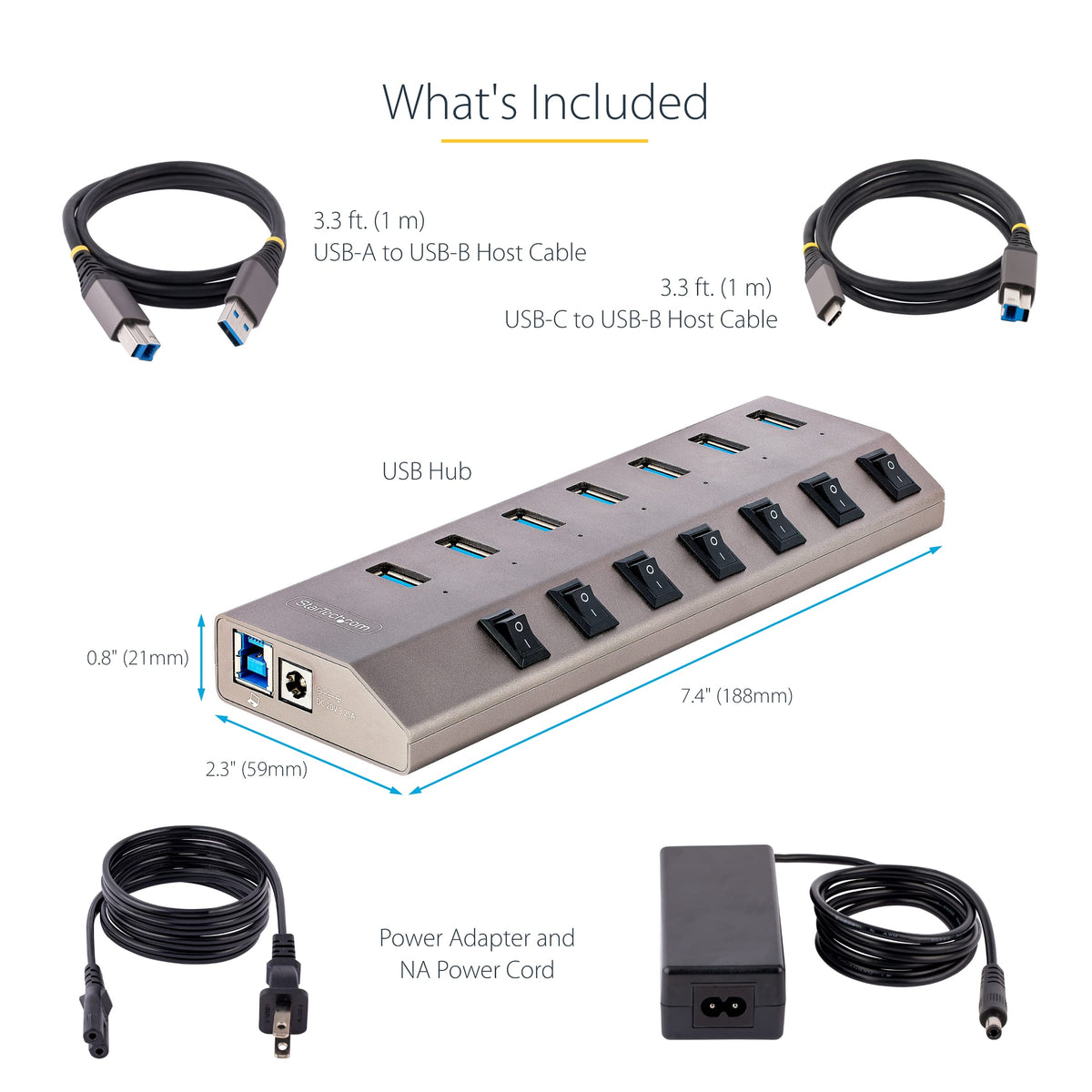 Q: What is included with the StarTech 7-Port USB Hub?A: The package includes the 7-Port USB Hub itself, along with a 65W power adapter and 3.3ft (1m) USB-C and USB-A host cables, giving you everything you need to connect to both USB-A and USB-C devices right out of the box.