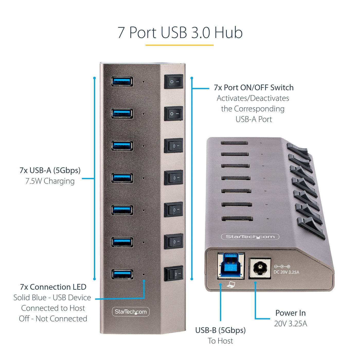 This 7-Port Usb 32 Gen 1 (5Gbps) Hub Adds Seven Usb Type-A Ports To A Computer, With The Added Benefit Of Each Port Having An Individual Onoff Switch The Seven Ports On The Usb Hub Feature A Power Switch To Turn Off The Computers Datapower Connection To The Attached Device When Its Not Being Used This Means You Can Turn Off Individual Usb Ports To Reduce Power Consumption, Without Having To Physically Disconnect The Device Or Cable All Seven Ports On This Usb Hub Support Bc 12, Providing 15A (75W) Of Power Simultaneously (525W Total), Making It Ideal To Charge Battery Powered Usb Devices Like Smartphones, And Tablets, While Also Providing A Data Connection The Usb Hub Will Provide Power With Or Without A Host Computer Connected, With Support For Both Cdp (Charging Downstream Port) & Dcp (Dedicated Charging Port) Applications The 7-Port Usb Hub Is Os Independent Supporting All Operating Systems Including Windows, Macos, Chrome Os, Ipad Os And Android, And Installs Automatically When Connected To A Computer