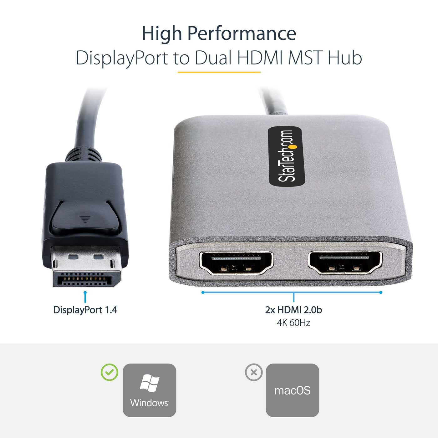 This Displayport To Hdmi Mst Hub Drives Two 4K 60Hz Hdmi Monitors From A Displayport Enabled Windows Device Multi-Tasking Made Easy This Displayport To Hdmi Video Splitter Allows You To Connect Up To Two Additional Displays In Extended Or Mirror Mode Connecting Two Independent 4K 60Hz Displays Creates High-Performance Workstations For Users In Your Organization, Enabling Easier Multi-Tasking, Resulting In Increased Productivity 4K At 60Hz And Hdr Multi-Stream Transport (Mst) Technology Combines Multiple Video Signals Into A Single Signalstream This Mst Hub Separates The Single Stream Into Two Independent Signals, One For Each Hdmi Enabled Display Support For High Dynamic Range (Hdr) Offers Increased Contrast, Brightness, Colors, And Greater Luminosity Hassle-Free Setup Native Support For Mst, On Any Windows Device, Enables An Easy Set Up Plug-And-Play Installation With No Drivers Or Software Required A 12In (30Cm) Attached Cable Provides Options For Flexible Installation Configurations, Reducing The Amount Of Strain On Ports And Connectors Additionally, This Dual-Monitor Splitter Is Usb Powered (Usb Cable Included)