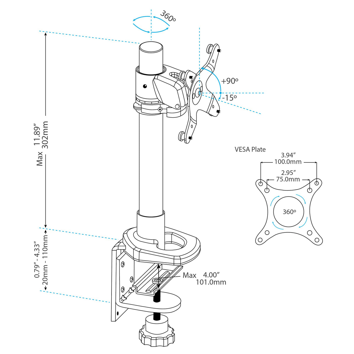 Save Space And Work In Greater Comfort With This Monitor Desk Mount. The Simple And Stylish Monitor Pole Lets You Mount A Single Vesa Mount Monitor (75X75, 100X100) Above Your Desk Or Table, And Adjust The Position Of Your Display For Ideal Viewing. With The Computer Screen Mount, You Can Suspend Your Display On A Support Post Above The Desk Surface And Adjust Your Display Height, Position And Viewing Angles Easily For An Ergonomic Work Environment. The Display Mount Gives You The Added Benefit Of Reclaiming Valuable Workspace On Your Desk. The Steel Single-Monitor Mount Securely Supports Displays Up To 34'', With A Maximum Weight Of 30.9Lb / 14Kg. The Height Adjustable Monitor Arm Features An 11.89'' (302Mm) Tall Support Post, So You Can Adjust The Height Of Your Monitor Along The Pole. Enjoy Optimum Viewing With Easy Tilt Adjustment. The Vesa Mount Can Be Rotated 360 Degrees Around The Support Pole To Adjust Your Screen Position. For Viewing Longer Pages Or Blocks Of Code Without Scrolling, The Monitor Arm Also Supports Landscape To Portrait Display Rotation. The Display Mount Is Made Of Steel For Long-Lasting Performance. The Desk Clamp Monitor Mount Is Easy To Install. For Added Installation Flexibility, The Included Mounting Hardware Can Either Clamp To The Side Of Your Desk, Or Mount Through A Grommet Hole. The Display Mount Integrates A Cable Management Hook To Keep Things Neat. The Taa Compliant Single Monitor Desk Mount Is Backed By A Startech. Lifetime Technical Support.