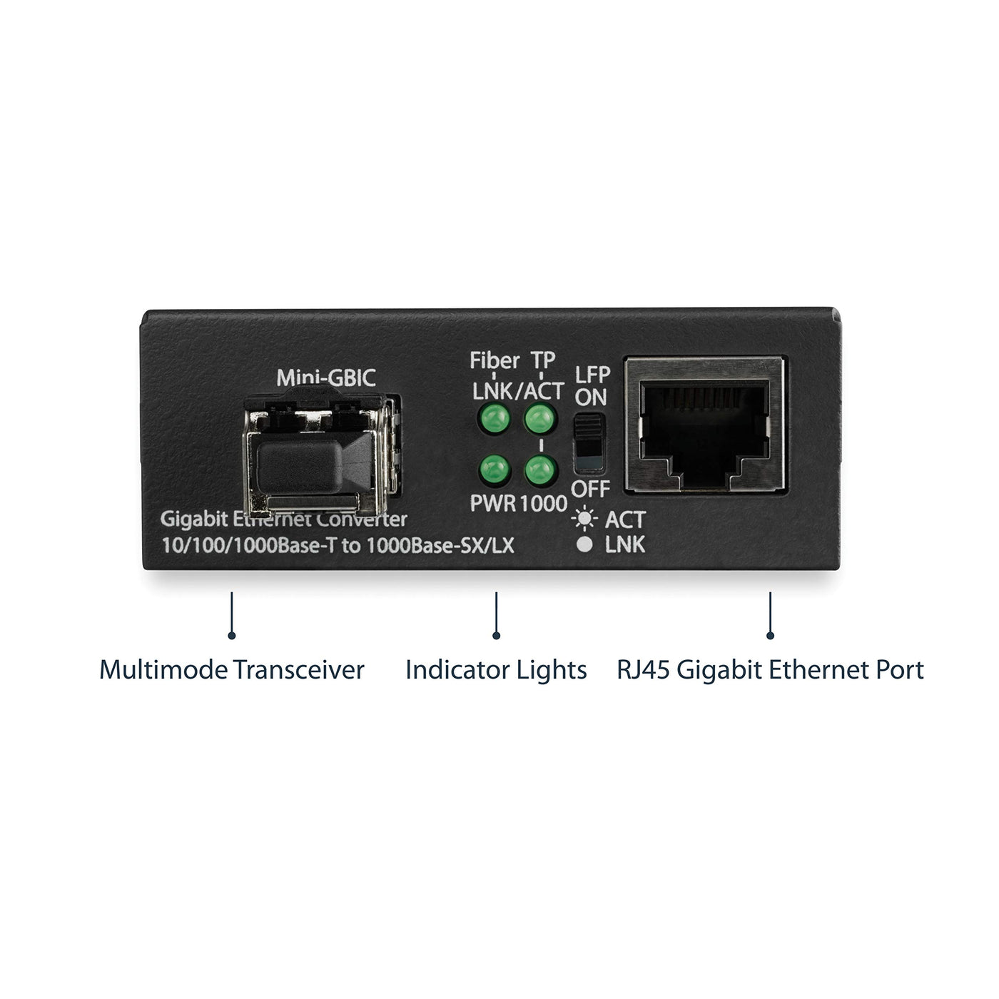This Lc Fiber Media Converter Offers An Easy Way To Extend Your Network Over Gigabit Fiber (With A Maximum Data Transfer Rate Of 1000 Mbps In Full Duplex Mode) It Is Equipped With A Multimode Sfp (Mini-Gbic) Transceiver Which Converts A Copper Rj45 Ethernet Connection To Gigabit Fiber To Extend Your Network Over Longer Distances Or Connect Workstations To Switches The Converter Supports Full Duplex Operation, Linkfault Pass Through (Lfp), Auto Mdix And 9K Jumbo Frames, And Provides A Powerful Extended Networking Solution For Campuses, Businesses, Government Facilities, Stadiums Or Other Areas Requiring Network Access The Gigabit Fiber Media Converter Provides A Cost-Effective Solution For Shorter Range Network Extensions It Connects An Ethernet Network To Remote Devices Over A Fiber Backbone, With A 550M 1804Ft Range On The Fiber Optic Interface This High Performance Media Converter Has A Durable Metal Housing, Engineered To Deliver Long-Lasting Performance - Perfect For It And Business Professionals Fully Compatible With 101001000Base-T Ethernet Networks (With A Maximum Data Transfer Rate Of 1000 Mbps (1 Gbps)), The Converter Supports Auto Negotiation To Bridge Different Speed Networks And Devices To A Gigabit Fiber Network It Provides Versatile Connectivity To Your Existing Networks And Devices, Allowing You To Maximize The Usage And Performance Of Legacy Equipment The Included Multimode Sfp Transceiver Is Removable, Giving You The Flexibility To Change Your Transceiver In The Future To Meet Your Networking Needs The Unmanaged Fiber Media Converter Has A Standalone Design With Simple Plug And Play Set-Up To Ensure Fast And Easy Installation Compact In Size, The Converter Gives You Flexible Installation Options - Including A Wall Mounting Option To Save Space This 101001000 Mbps Multimode Fiber Media Converter Is Backed By A Startech