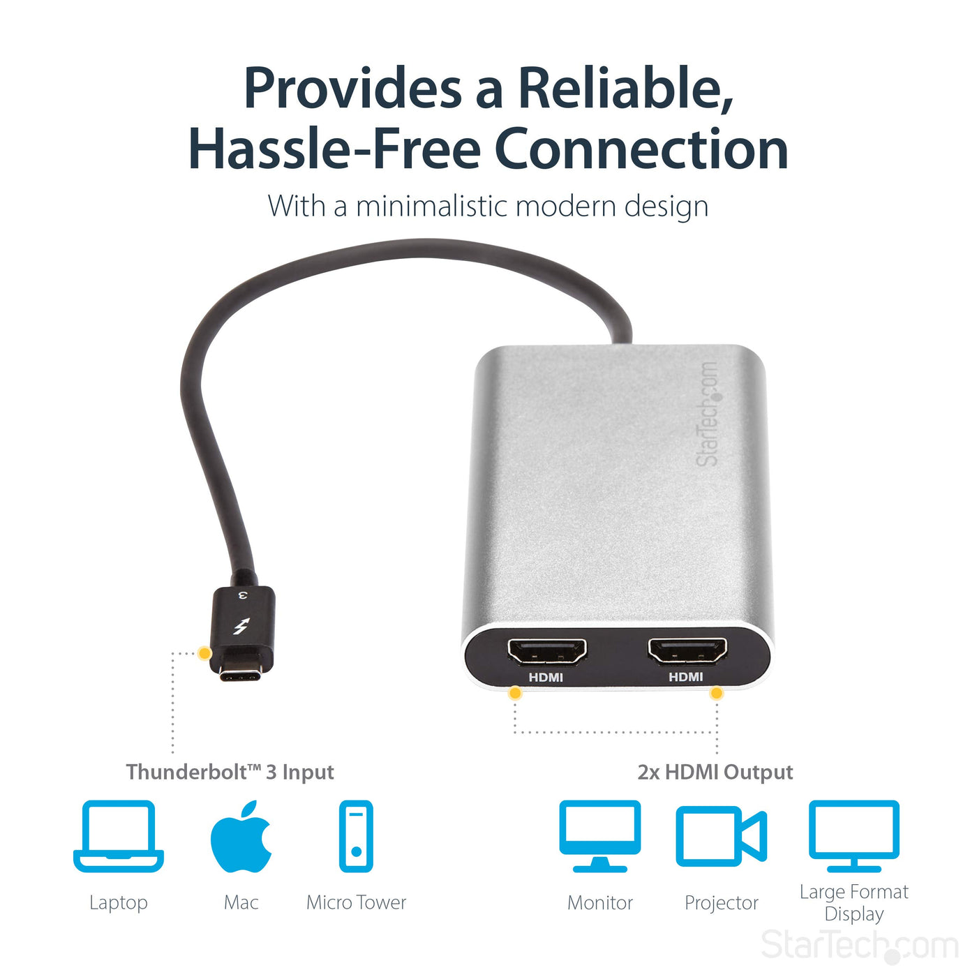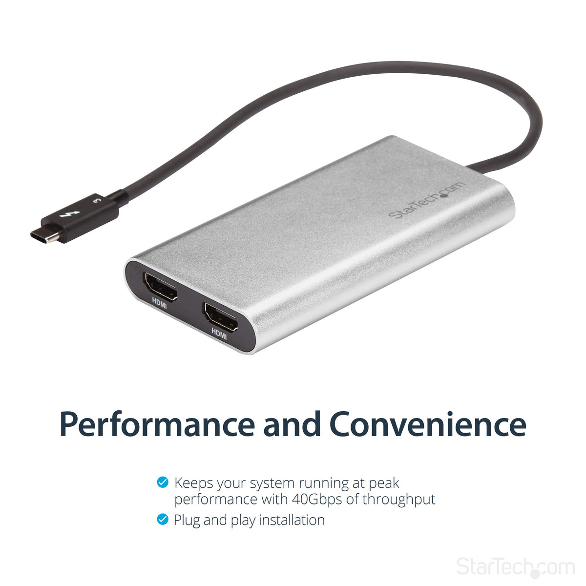 This High-Performance Thunderbolt 3 Adapter Lets You Add Two 4K 60Hz Hdmi Monitors To Your Windows Or Mac Computer Through A Single Thunderbolt 3 Port.The Thunderbolt Video Adapter Is Compatible With Computer Systems That Support Thunderbolt 3, Such As Models Of Macbook Pro, Dell Precision And Dell Xps. Thunderbolt 3 Is A Protocol That Uses The Usb-C Connector, But Your Computer System Must Support Thunderbolt 3 In Order For The Adapter To Function As Expected. If You Connect The Adapter To A Usb-C Port That Does Not Support Thunderbolt 3, The Adapter Will Not Function.With An Unprecedented 40Gbps Of Throughput, Thunderbolt 3 Enables You To Achieve The Previously Impossible Feat Of Using A Single Port On Your Laptop To Output Dual 4K Resolution At 60Hz To Two Independent Displays. This Performance Lets You Run The Most Resource-Demanding Applications Imaginable. You Can Output Independent Content To Each Display At Resolutions Of Up To 4096 X 2160P (60Hz), Which Is Perfect For Editing 4K Video Or Performing Other Ultra Hd Tasks Such As Creating Cad Drawings Or Reviewing Medical Imagery.Functioning As An External 2-Port Graphics Adapter With Audio Support, This Is A Compact And Convenient Alternative To A Laptop Dock When You Don'T Need Full Docking Capability.With Two Uhd 4K Displays, You Can Work More Efficiently From Your Laptop, So You Can Accomplish More In The Same Amount Of Time. With Each Display Delivering 4K Performance, You Can Have Four Times The Screen Space Compared To 1080P. Creative Professionals Can Be More Productive With The Freedom To Edit 4K Video On One Display While Previewing Raw Video Playback On The Second 4K Display.This Adapter Helps To Keep Your System Running At Peak Performance. Unlike Usb External Video Solutions, Thunderbolt 3 Lets You Run Ultra Hd 4K Resolution At 60Hz On Both Displays Without Draining System Resources.Because It'S Backward Compatible With Your High-Definition 1080P Displays, This Is A Great Accessory For Home, Office Or Other Desktop Workspace Applications.The Tb32Hd24K60 Is Backed By A 2-Year Startech.