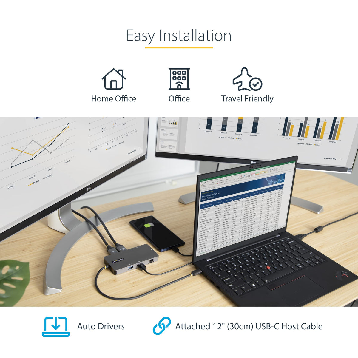 This Usb Type-C Multiport Adapter With Dp 1.4 Alternative Mode, Dsc And Mst, Supports Dual-Hdmi&Reg (Hdr) Video With Resolutions Of Up To 4K 60Hz Uncompressed Video. The Mini Travel Dock Turns Your Dell Xps, Lenovo X1 Carbon, Hp Eliteprobook, Or Other Usb-C Laptop Into A Workstation, Anywhere You Go. The Usb-C Docking Station Provides Dual Hdmi Outputs, A 2-Port Usb 3.2 Gen 1 Type-A (5Gbps) Hub Including A Bc 1.2 Port To Power And Charge A Usb Peripheral, Sd And Microsd Card Readers, And A Gigabit Ethernet Port, All Through One Connection To Your Laptops Usb-C Or Thunderbolt 34&Trade Port. In Addition, It Offers Advanced Charging Through Usb Power Delivery (Pd) 3.0 Pass-Through Via An Integrated 12-Inch (30 Cm) Usb-C Host Cable, For More Set Up Flexibility. High-Performance Dual-Hdmi Video Via Mst The Compact Docking Station Connects Your Laptop To Two Hdmi Monitors, Creating A Powerful Workstation. It Supports Dp 1.4 Alt Mode With Dsc And Mst, For Uncompressed Video Performance Up To Dual 4K (3840 X 2160P) At 60Hz, Depending Upon Your Host Computer. The Dock Also Supports The Use Of Ultrawide Monitors. Video Performance, Such As Resolution And Refresh Rate Across Both Monitors, Is Dependent Upon Your Host Computer And Its Video Controller. A Source Device With Support For Displayport 1.4, Paired With Dsc And Dp 1.4 Enabled Hdmi Displays, Are Required To Achieve Dual 4K 60Hz. Please Review The Specifications Of Your Computer And Displays, To Determine Expected Video Performance. Startech.Com Performs Rigorous Performance Benchmarks With All Major Computer Models. The Video Performance Results Of Our Testing Are Listed Below: Dual Display Host Computer Model Monitor #1 Maximum Resolution Monitor #2 Maximum Resolution Lenovo X1 Carbon G9 3840X2160@60Hz 3840X2160@60Hz Hp Elitebook 850 G8 3840X2160@60Hz 3840X2160@30Hz Dell Xps 9310 2560X1600@60Hz 2560X16