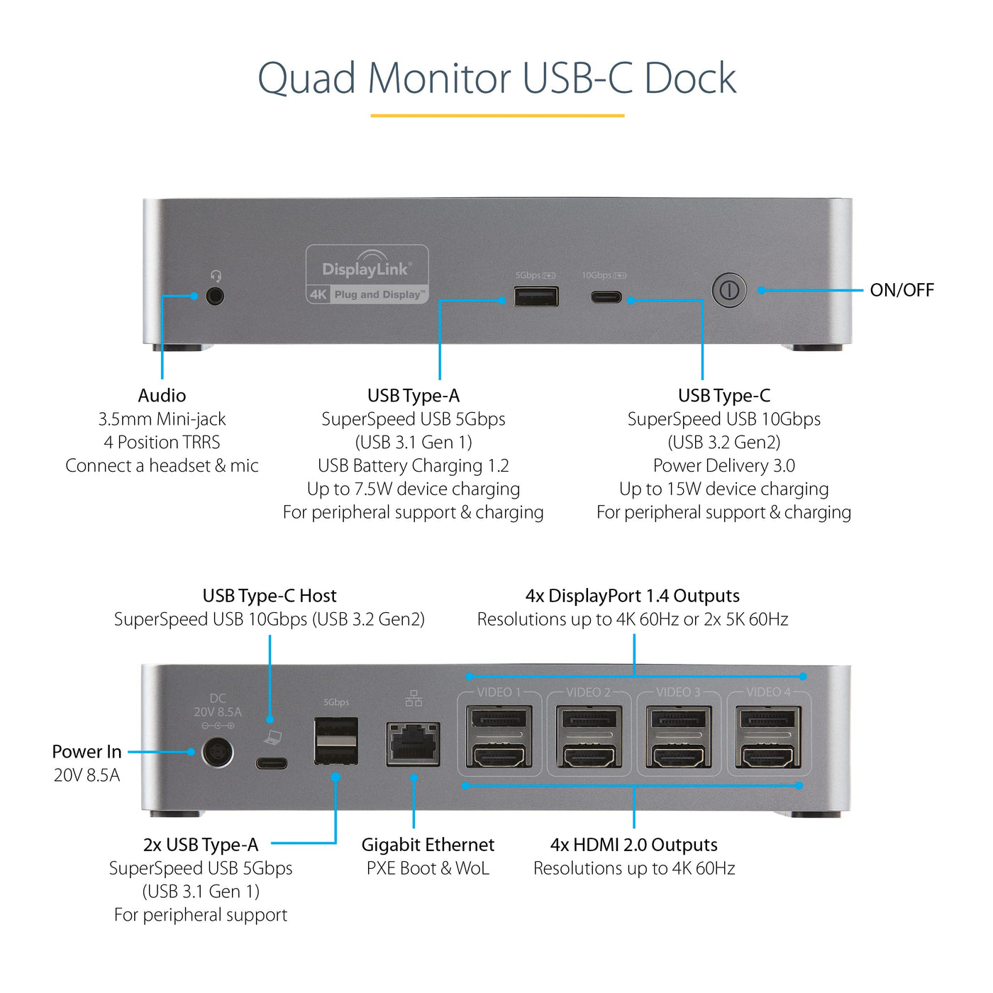 This Usb-C Docking Station Is A Versatile Solution For Transforming A Usb-C Or Thunderbolt Laptop Into A Powerful Workstation. Supporting Up To Two, Three Or Four Displays With Any Combination Of Hdmi And/Or Displayport Video Outputs, It Delivers Impressive Resolutions Of Up To 4K 60Hz. Additionally, The Dock Provides A 4-Port Usb Hub With Multiple Ports, Including Select Usb-A And Usb-C Ports With Bc 1.2 Charging. This Docking Station Is Compatible With Windows, Chromeos, And Macos, And It Even Supports Extended Displays On Apple M1/M2 Macbooks Via Displaylink Technology. It Also Includes Practical Features Like Gigabit Ethernet, A Trrs Stereo Audio Headset/Mic Port, And 100W Power Delivery For Laptop Charging. For It Professionals, The Dock Comes With Connectivity Tools Software That Provides Network Mac Address Pass-Through, Wifi Auto Switching, Usb Event Monitoring, And Windows Layout Utilities For Added Convenience And Network Security. This Product Is Backed For 3-Years, Including Free Lifetime 24/5 Multi-Lingual Technical Assistance.