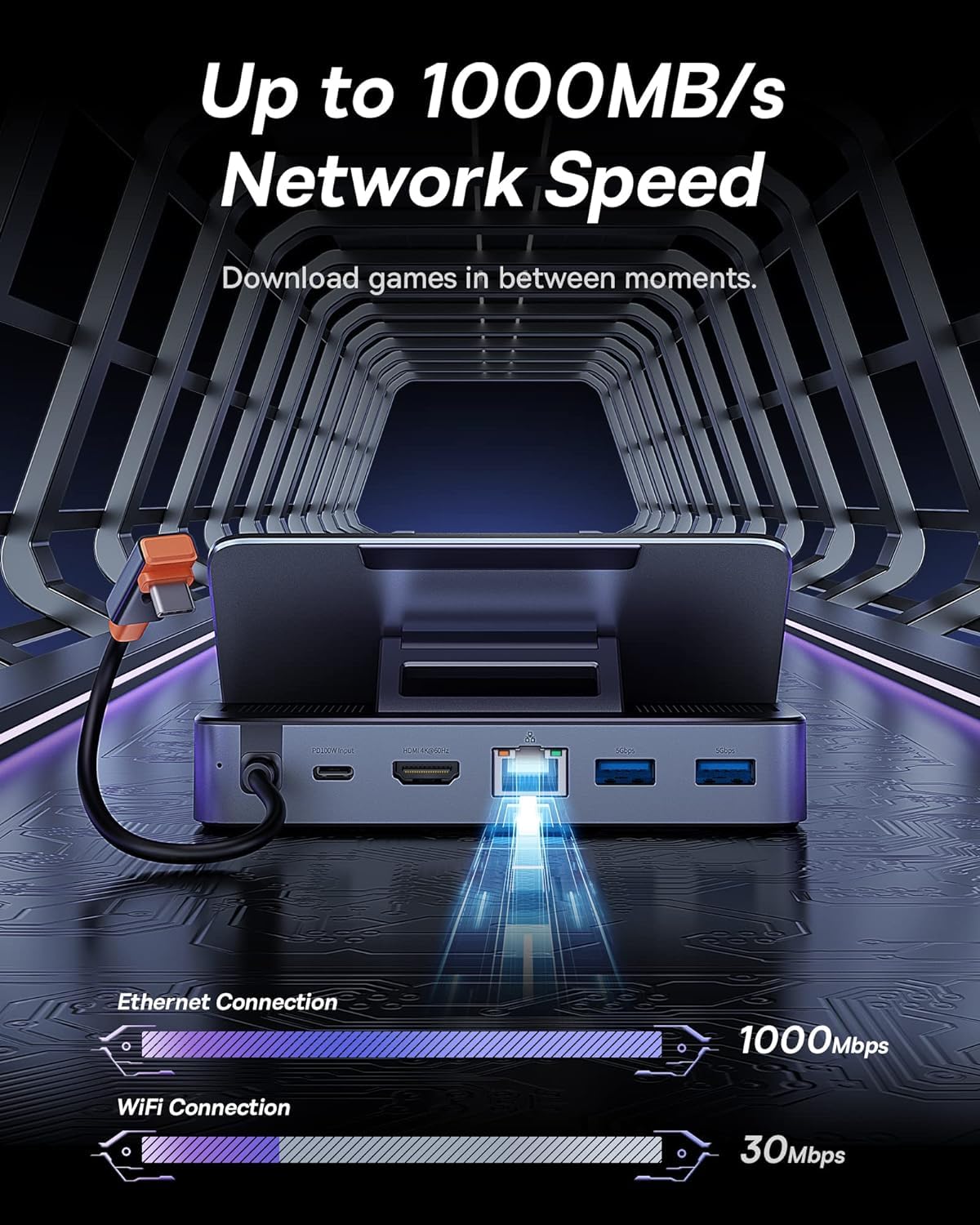 Steam Deck Dock, Baseus 6 In 1 Docking Station For Steam Deck/Rog Ally X/Legion Go With Hdmi 2.0 4K@60Hz, Gigabit Ethernet, Adjustable Stand Design, 100W Pd And 3 Usb A 3.0 Ports
