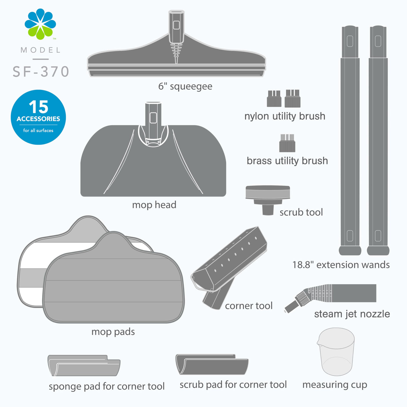 Q: What accessories are included with the Steamfast SF-370 for multi-purpose cleaning?A: The Steamfast SF-370 comes with 15 accessories including mop pads, utility brushes, a jet nozzle, a squeegee, and scrub tools, making it versatile for various cleaning tasks throughout your home.