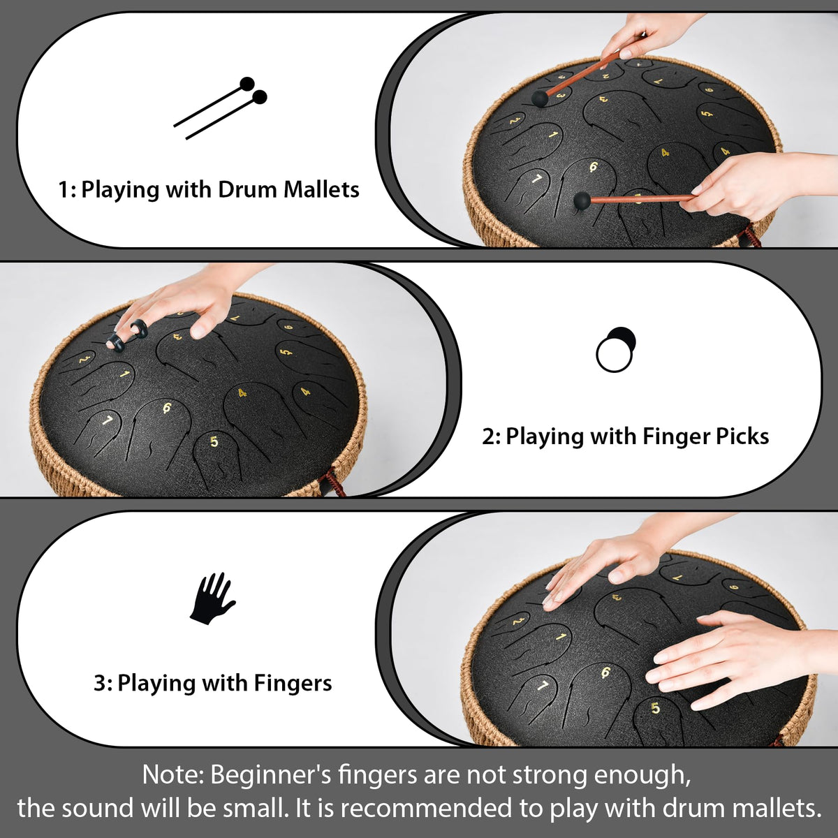 The Steel Tongue Drum Is The&Nbsp;Ultimate Instrument For Exploring Soft Tones And Harmonic Melodies!&Nbsp; It Is Made Of High Quality Steel And Produces Mesmerizing Soft Tones, Perfect For Meditation, Yoga, Music Therapy And Musical Expression.&Nbsp; In Addition To This, The Drum Comes With Songbook, Drumsticks And Carry Bag.&Nbsp; Whether You'Re A Musician Or A Beginner, This Drum Is An Must-Have For Transporting Yourself Into A World Of Peace And Harmony.