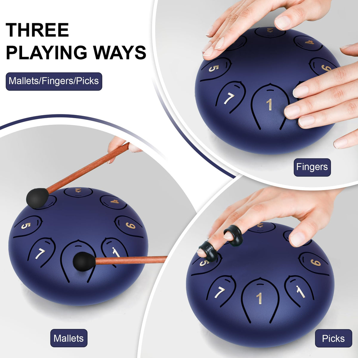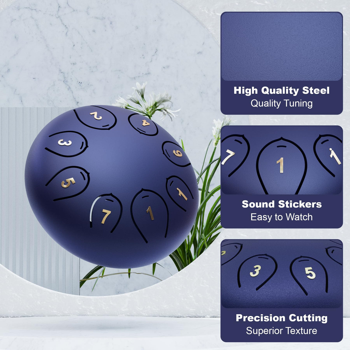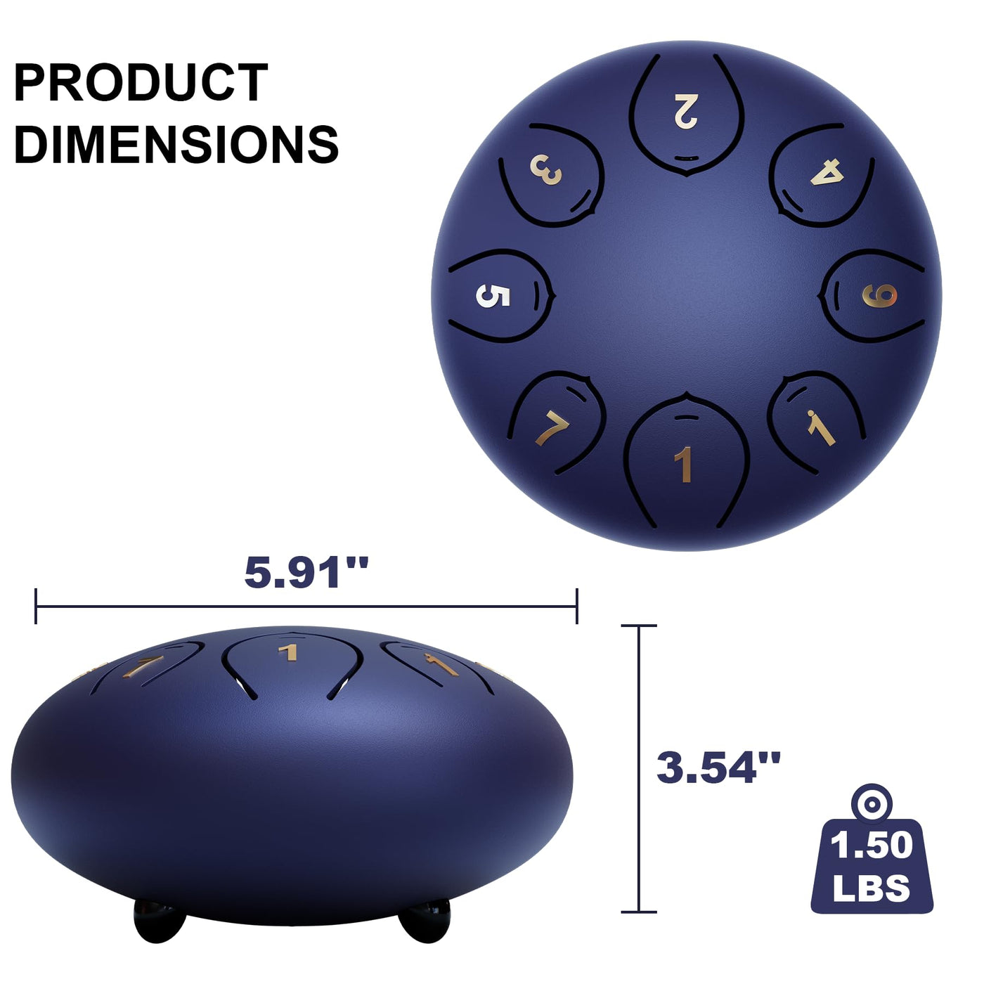 Discover The Beauty Of Sound With The Lidguni Steel Tongue Drum. This 6-Inch Steel Tongue Drum With 8 Notes In The C Key,&Nbsp; Produces A Soothing, Ethereal Sound For Stress Relief And Relaxation. It Produces Sounds Just By Tapping And Comes With Sound Stickers To Help You Learn, Making It Perfect For Beginners And Children.&Nbsp; Each Drum Comes With A Carry Bag, Songbook, Drumsticks, Finger Picks And Mallet Holder, Making It The Perfect Gift For Music Lovers And Aspiring Musicians. Let Our 6 Inch Steel Tongue Drum Bring You The Joy Of Music!