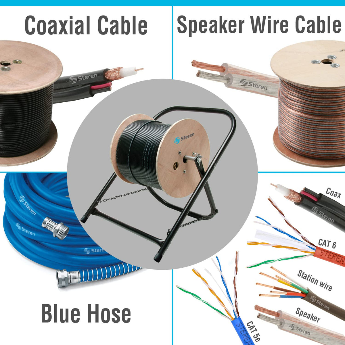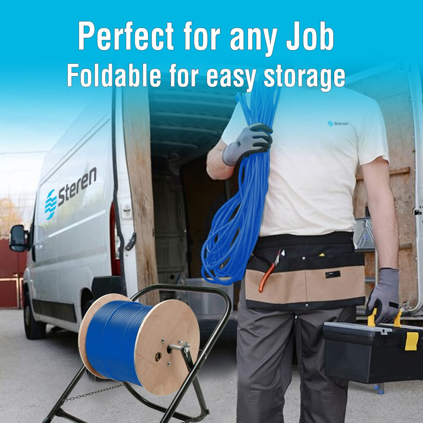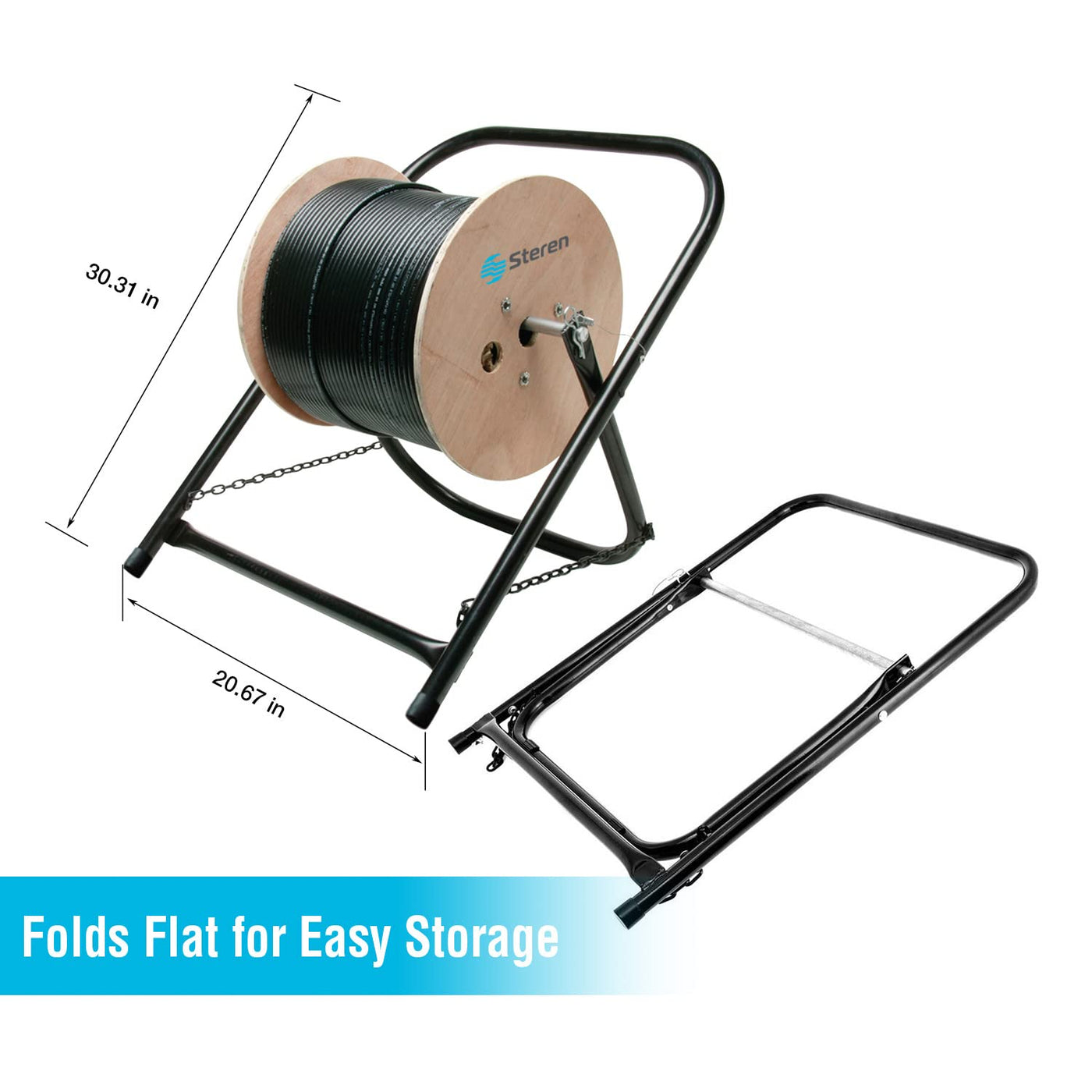 The STEREN Cable Caddy folds flat for convenience, ease of use and easy storage. The STEREN Cable Caddy holds one reel of cable up to 100 pounds (lbs.) / (45 Kg.) and dimensions of the cable spool of up to 20' Inches x 16' Inches. The STEREN Cable Caddy removes the hassle out of bulk cable installations, it allows to pull cable safely and conveniently. Built from a light weight, yet very durable and resistant frame.