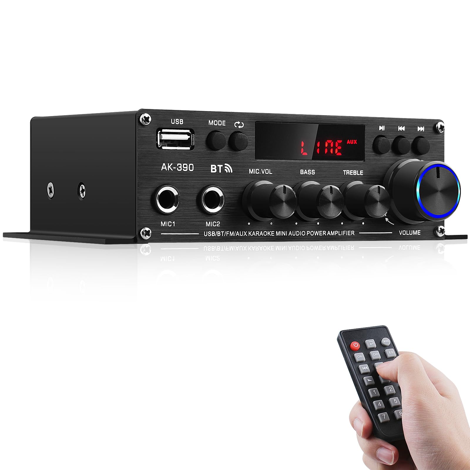 Ak390 Bluetooth 5.0 Power Amplifier 2.0Ch 40W X 2 Output Max 300W Subwoofer Hi-Fi Audio Amplifier Receiver With Remote Control,Fm Antenna For Car Home Bar Party Features: 1. Bluetooth5.0 Rca Sd Usb Input, 2.0 Channel Stereo Output, Just Little Sound Distortion. 2. Hifi Sound Quality, You Will Enjoy A More Perfect Sound Quality Experience. 3. Mic Volume And Volume,Treble And Bass Control Knobs. 4. With 2 Mic Jacks, You Can Sing Karaoka At Home. 5. With Remote Control And Us Plug For Easy To Use. 6. U-Disk And Memory Card Reading, Plug And Play. 7. With Fm Function Ak-390 Audio Amplifier Wide Compatible With Mobile Phones, Computers, Tablets, Notebooks, Mp3, Mp4,Tvs And Projectors With Av Audio Etc . Use Occasion: Ak390 Audio Amplifier Is Widely Use Indoor And Outdoor, Such As Family, Party, Bar, Concert,Carnival Etc. Specifications: Product Name: 2.0 Channel Bluetooth Audio Power Amplifier Product Model: Ak-390 Version: Bluetooth 5.0 (5 Meters If Unobstructed) Input Sensitivity: 500Mv Signal To Noise Ratio:>85Db Frequency: 20-20Khz Distortion Rate: =0.5% Audio Input: Bt, Rca, Mic, Aux,Usb Channel: 2.0Ch Fm Faction: Support Adapted Speaker: Below 40W, 4-16O Speakers Power Range: Dc12V/5A Power Supply Output Power: Rated Power: 40W + 40W, Peak Power: 300W+300W Product Size: 7.1In*5.4In*2.7In Package Weight: 1.76Lb Package Including: 1 X Ak390 Audio Power Amplifier 1 X Remote Control 1 X Us Power Supply 1 X Fm Antenna2 X User Manual