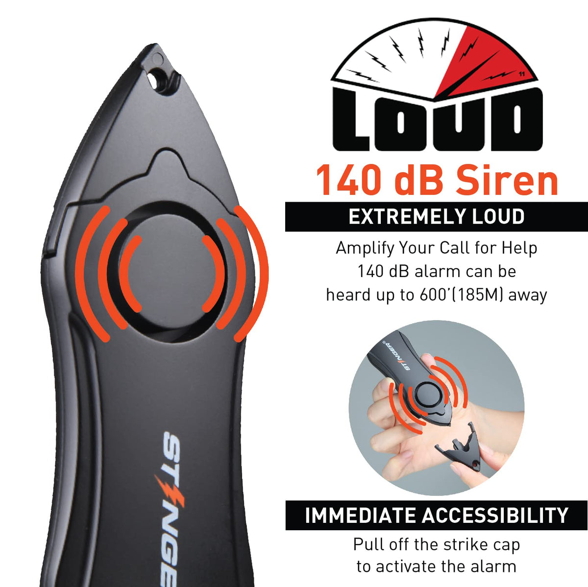 Q: How loud is the Stinger Personal Alarm Keychain?A: The Stinger Personal Alarm Keychain features a powerful 140db siren, which can be heard from up to 600 feet away, making it an effective tool for drawing attention in emergency situations.