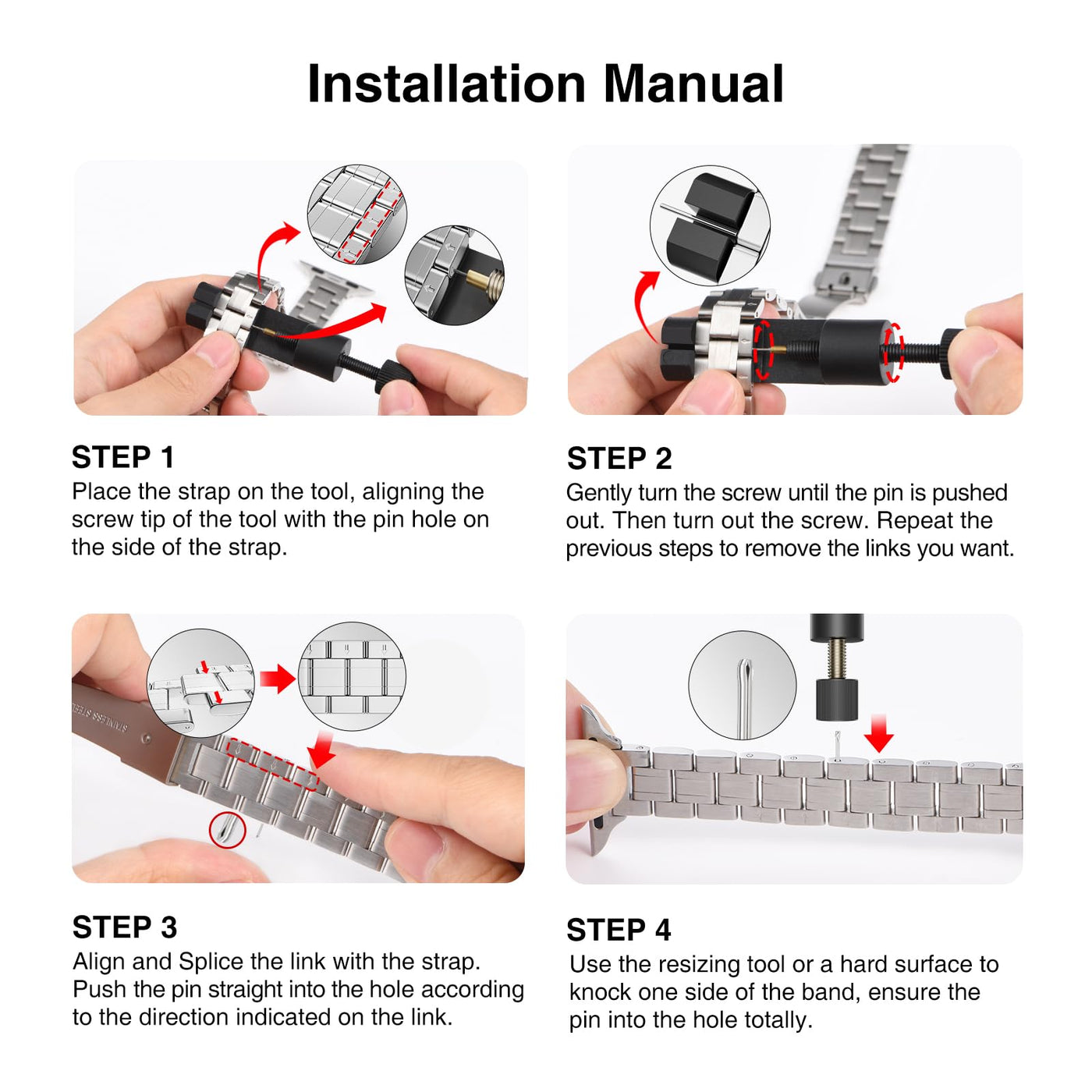 Q: How do I adjust the size of the STIROLL Stainless Steel Band?A: Adjusting the STIROLL Stainless Steel Band is simple. Use a link remover tool to push out the pins. Follow the instructions carefully to avoid damaging the band, ensuring you align the screw tip with the pin hole and gently rotate the screw to remove or add links.