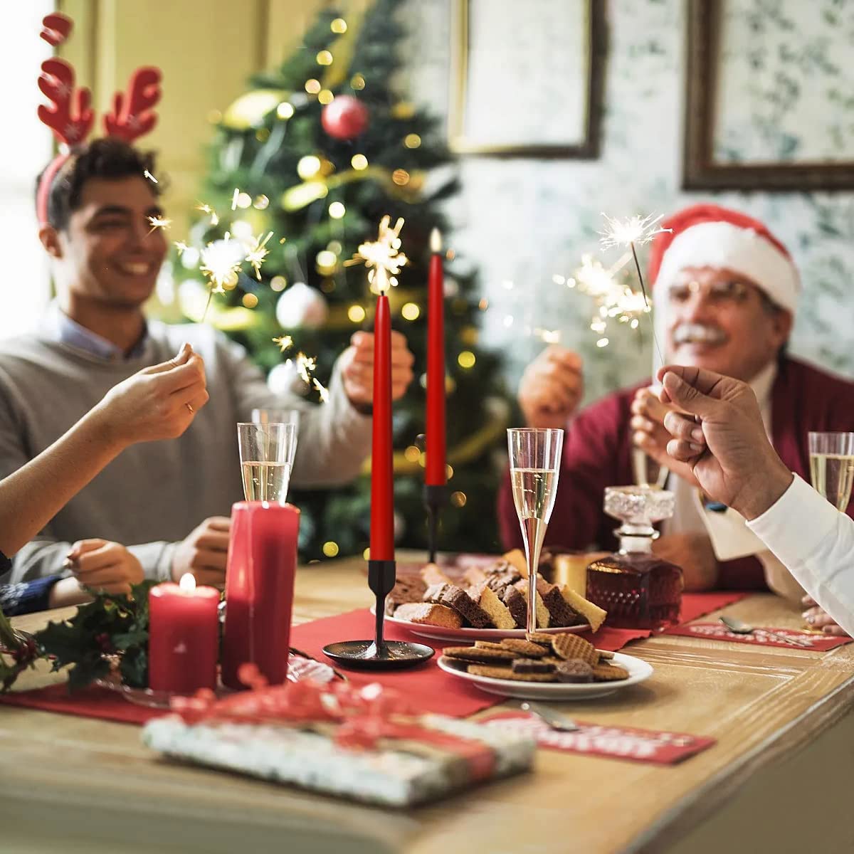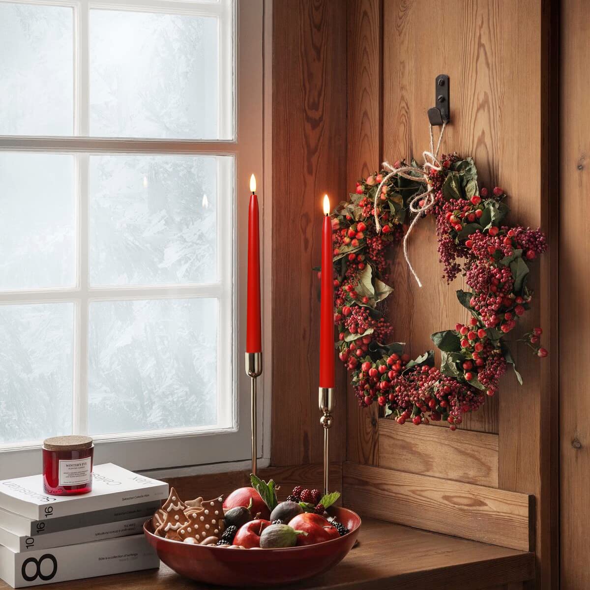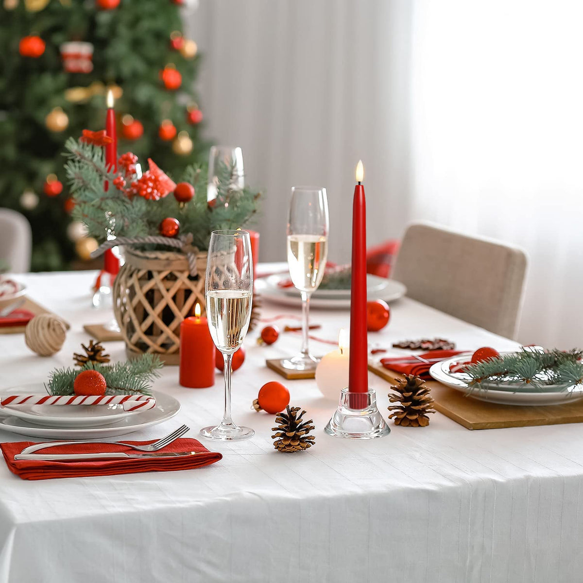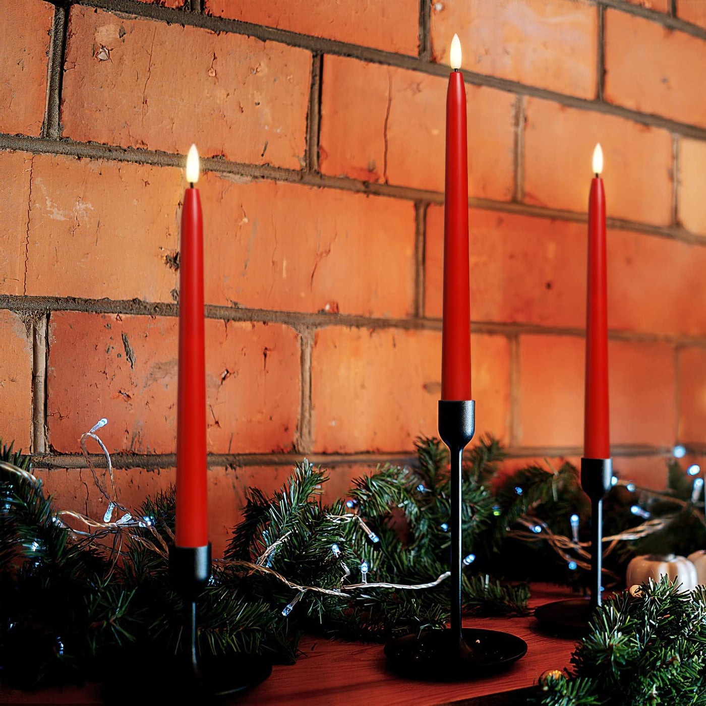 Battery Operated Christmas Taper Candle Set Includes 6 Red Flameless Tapers. Safe Battery Operated Red Candles. Candles Are 11 Inches High And Made Of Durable Plastic. Our Taper Candles Fit Into Virtually Any Taper Candle Holder. Flickering Warm White Led Flame.