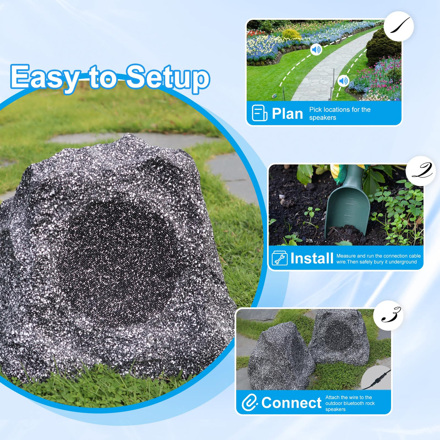 Product Name: Outdoor Speaker Waterproof Ipx6 Bluetooth Rock Speakers (Twins Paring System)2Pack 1. Parts: Check To Make Sure You Have The Following: Included: 1) 2 Rock Speakers( Main Speakerx 1, Sub Speakerx 1) 2) 3M Charging Cable X 1 3) 5M Waterproof Connection Wire X 1 4) User Manual X 1 2. Specification: - Water Resistance: Ipx6 - Color: Gray - Size: 8Inch - Connectivity Protocol: Bluetooth - Bluetooth Distance: 10-20 Meters (32-65Feets) - Max Speaker Output Power: 600W 3. Function: 1)With Bluetooth Speaker 2) With Twins Paring Function, Any 2 Speakers Can Be Connected By 1 Mobile 4. Applications - Back Yard D Cor And Entertainment - Patios Or Decks - Pool And Garden Areas - Spa Settings - Business / Office Outdoor D Cor