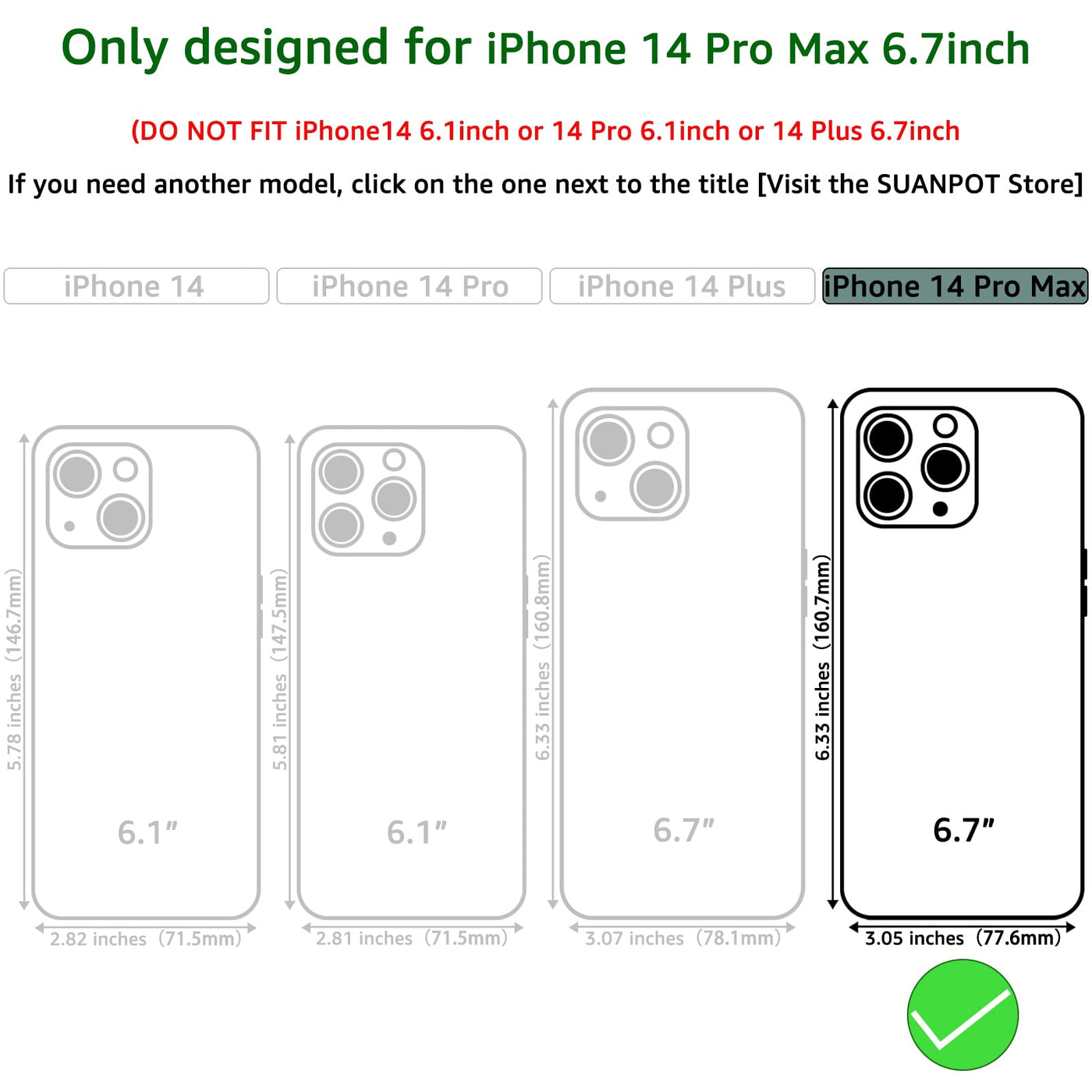 Q: Is the SUANPOT wallet case compatible with iPhone 14 Pro Max?A: Yes, the SUANPOT wallet case is specifically designed for the iPhone 14 Pro Max 6.7 inch. It does not fit other models like the iPhone 14 or iPhone 14 Pro.