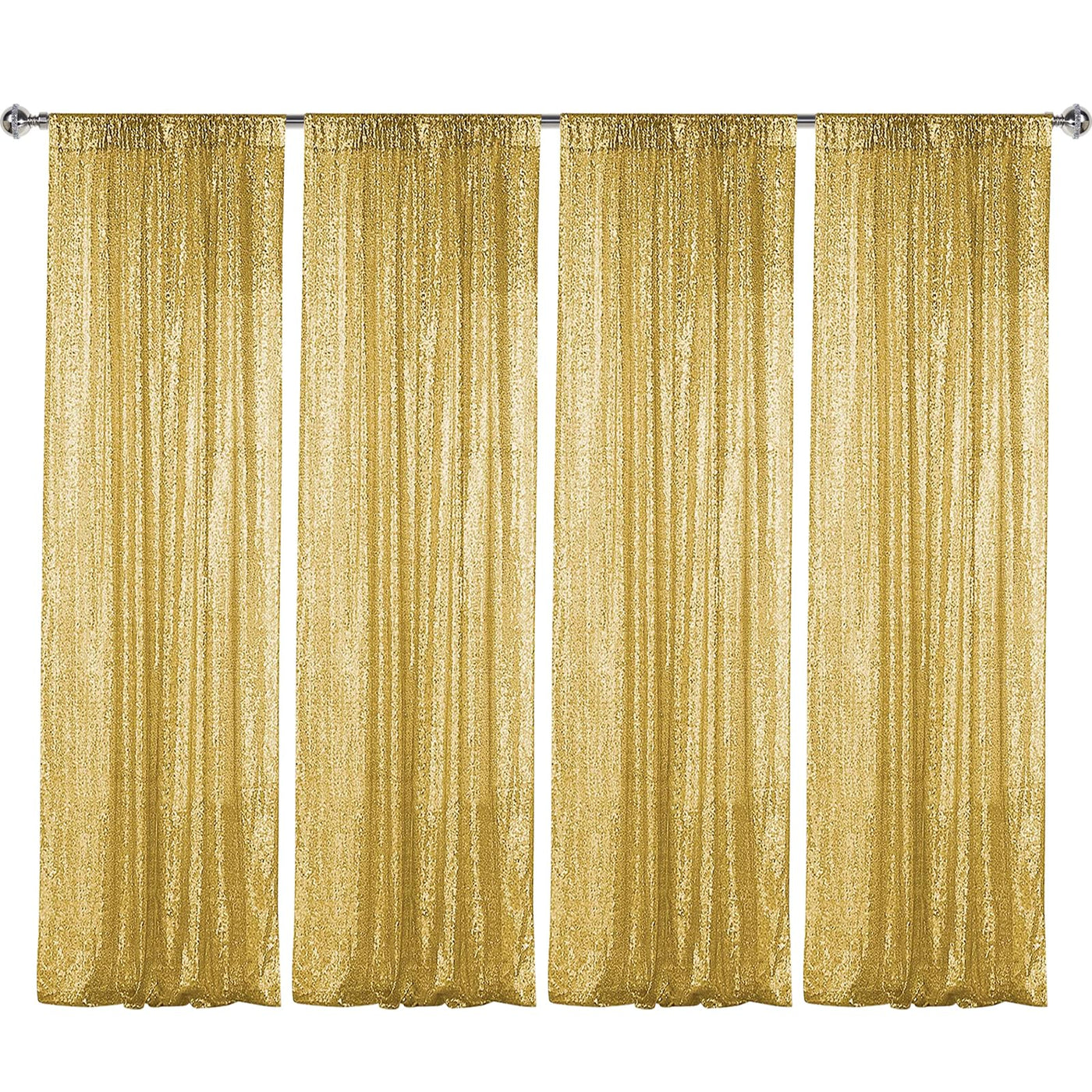 Package Include: 4Pcs 2Ft Wide X 8Ft Height Shiny Gold Sequin Background. Sequin Backdrop Curtains Are Easy To Install Because Of The 4-Inch Wide Rod Pocket On The Top. | Durable Material: The Gold Sequin Backdrop Is Made Of 3Mm Round Dense Sequins With Mesh Fabric Backing. All The Edges Of The Gold Backdrops Are Well Finished And Sequins Are Not Easy To Drop, So They Can Be Reused. | Elegant And Sparkly: Seamless Sequins Make The Backdrop Curtain Difficult To See Through Under The Lamplight, Offering A Glitter Effect In The Light. Creating A Luxurious Atmosphere For Your Scene Decoration. | Various Occasions: These Sparkly Background Drapes Can Be Used For Many Occasions: Wedding, Birthday, Party Decoration, Bridal And Baby Shower, Holiday, Celebration, Graduation, Photo Booths, Ceremony Backdrop And More.Also Perfect For Various Festivals: Christmas, Halloween, Thanksgiving And So On. | Care Instructions: It Is Recommended To Dry Clean, Do Not Machine Wash And Iron.