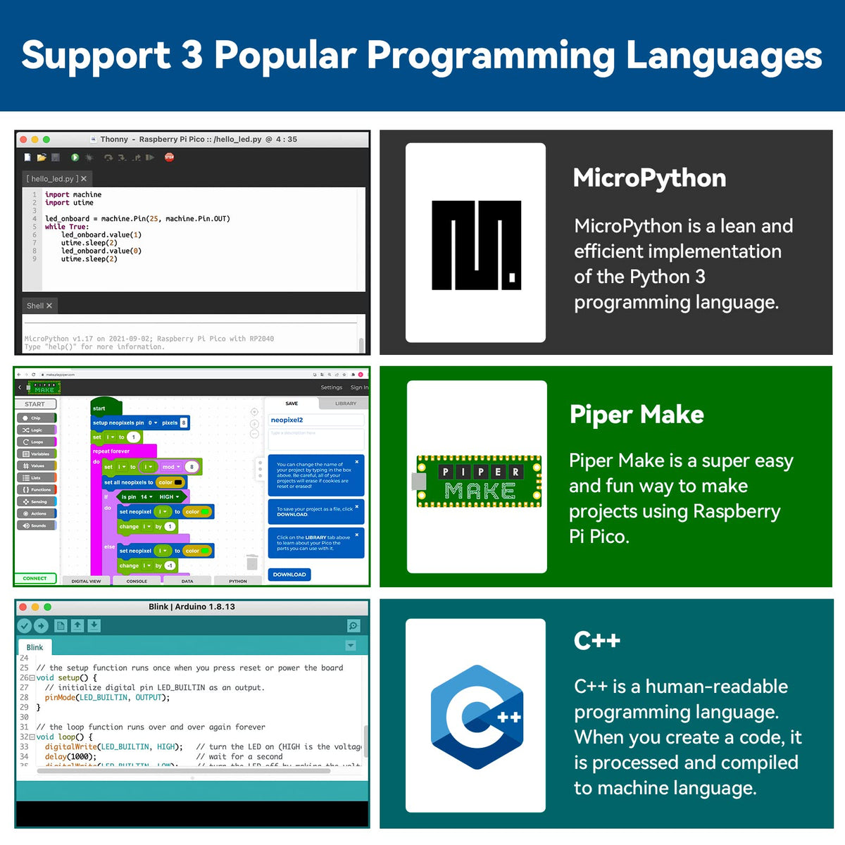 Q: What programming languages can be used with the Raspberry Pi Pico in this kit?A: The SunFounder Starter Kit supports three programming languages: MicroPython, with 18 projects; C/C++, which is compatible with Arduino IDE and has 13 projects; and Piper Make, a beginner-friendly interface based on Scratch, featuring 9 projects.
