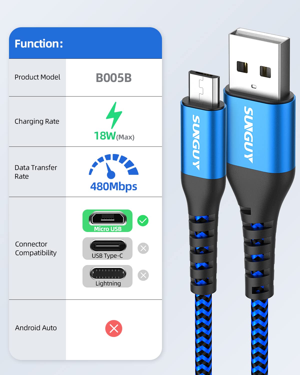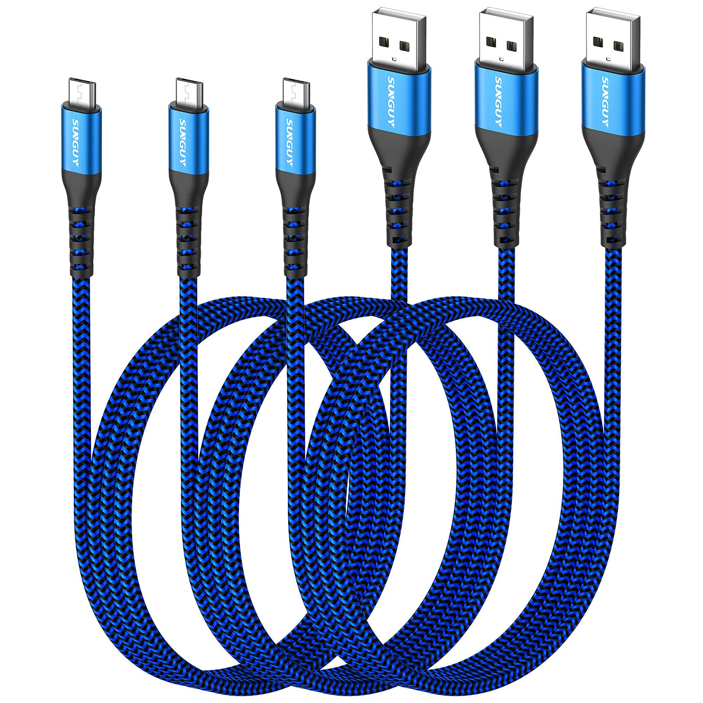 ?Fast Charge & Data Sync?The Micro Usb Cable Support Fast Charging Qc 2.0/3.0, Deliver Up To 18W(Max) Power. Data Transfer Support Usb 2.0, Rate Up To 480 Mbps. Two-In-One Charging And Data Transfer. | ?Durable And Flexible?Sunguy Usb Charger Cable Lead End Adopt High Quality Standard Micro Connecter,Perfectly Plug Into The Charge Port Of Your Devices; Aluminum Constructed Connectors Have Reinforced Flexible Jacket Necks To Reduce Damage From Bending,More Durable,Flexible,Wear-Resistant And Pull- Resistant. | ?3Ft Micro Usb Cable?3Ft Micro Usb Cable Is Perfect Length, Which Fit Snugly On Your Device And Ensures A Secure Connection Without Coming Loose Like Regular Micro Usb Cables. Ideal For Office, Home, Outdoor, Travel To Use. Easy To Carry, Tangle Free. | ?Wide Compatibility?Compatible With Samsung Galaxy S7 / S7 Edge / S6 / S6 Edge / S4 / A5 A7 A9 / Tab 4, ,Lg G4 G3 V10, Nokia, Motorola, Htc, Mp3 And More Devices With Micro Usb Connectors. | ?What You Get?You Will Receive 3 Pack 3Ft Blue Micro Usb Cable. If Any Questions Please Contact Us Via Amazon Email Or Sunguy Customer Support Email.