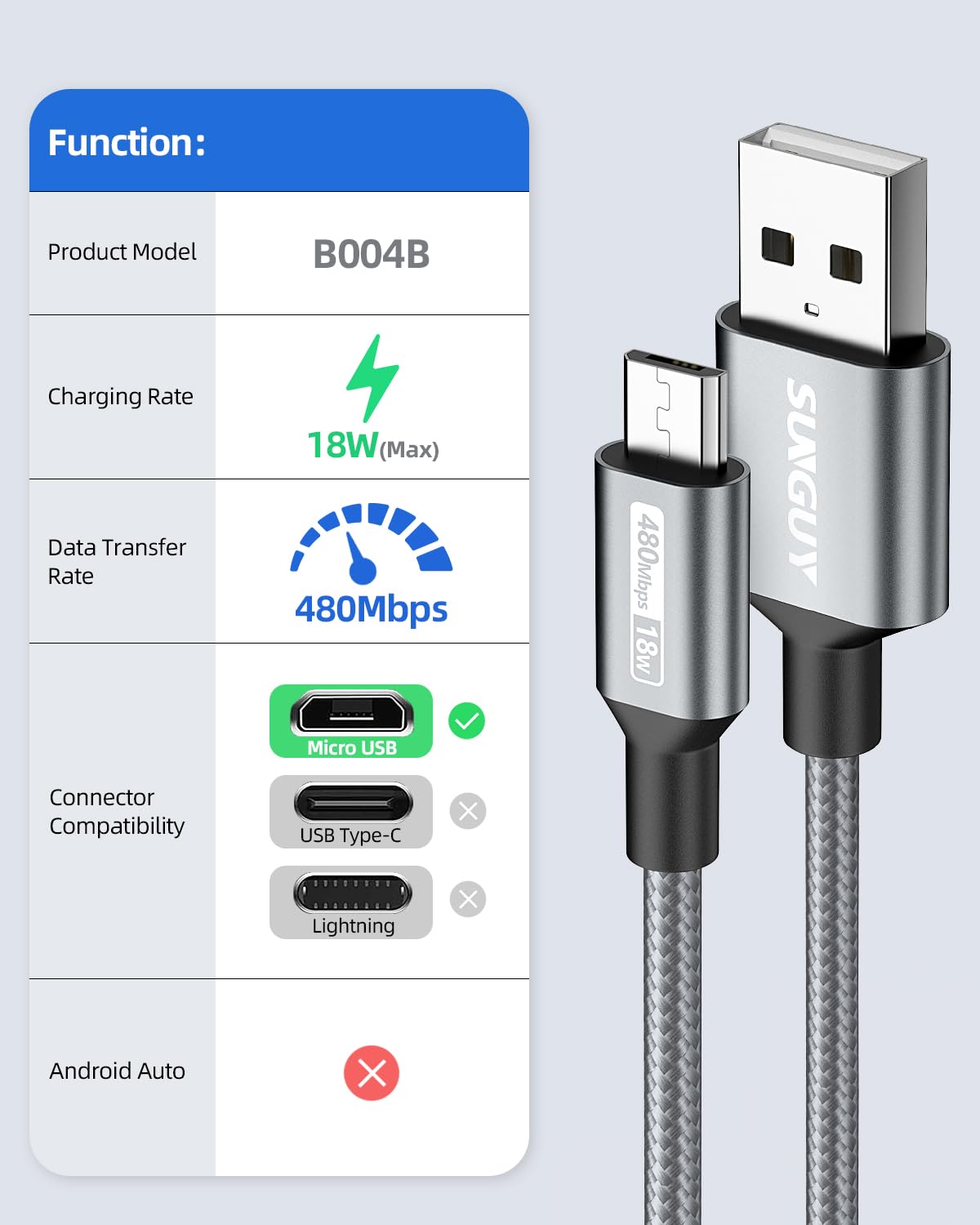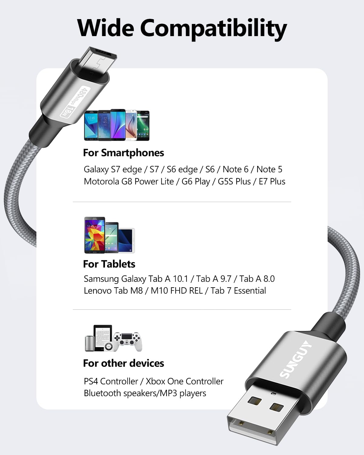 Specifications - Color: Gray - Length:0.5M/1.5Ft - Connector: Standard Micro Usb ; - Support Fast Charging; - Support Usb 2.0 Data Sync, Speeds Up To 480 Mbps Compatible With : - Samsung Galaxy S7/S7 Edge / S6 / S6 Edge / S4 / A5 A7 A9, Note 4 5 Tab Pro A S2,Etc; - Motorola Moto G4 / G4 Plus / G4 Play / G5S / G5S Plus / G5 / G5 Plus / E4 Plus / E4 ; - Huawei P9 Lite / P10 Lite /Mate 10 Lite / Mate 8 /Honor 7X ; - Lg V10 / G4 / Stylo 2 / Stylo 3 Plus / G Pro 2 / G Flex2; - Sony Xperia Z5 / Xperia Z3 / Xperia Z3 Compact ; - Nokia 6 / 5 / 3,Google Nexus 6 / Nexus 7; - And More Smart Devices With Micro Usb Connector. Warm Tips The Longer The Length Of The Micro Usb Cable, The Slower The Charging & Data Sync Speed Will Be. Sunguy 12 Month Warranty - If You Received The Wrong Item, Please Contact Us For Replacement. - If You Received Parcels With Missing Cable, Please Contact Us For Replacement Or Refund. - If There Is Any Problem With The Cable Used During The Warranty Period, Please Contact Us For Replacement Or Refund (Artificial Damage Except). Package Contents: 3 Pcs 0.5M/1.5Ft Micro Usb Cables