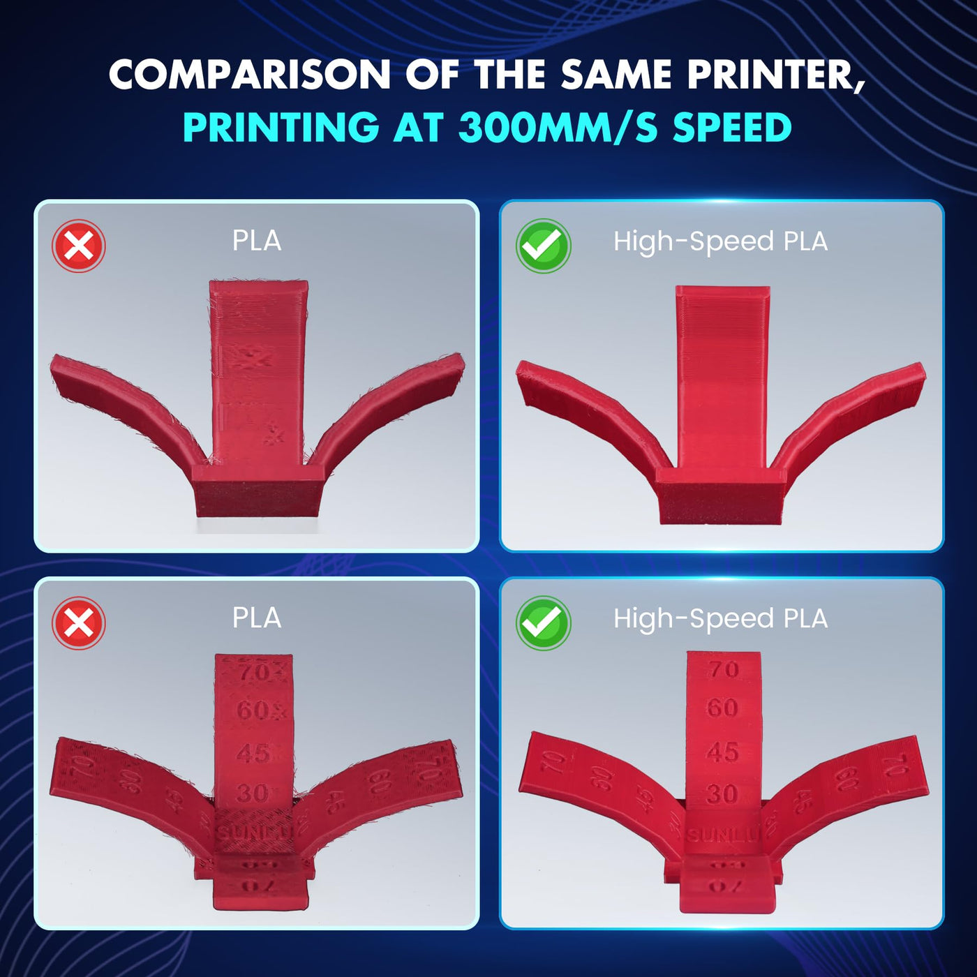 Q: What makes SUNLU High Speed PLA filament different from regular PLA?A: SUNLU High Speed PLA filament offers a 500% increase in flowability and a 180% improvement in heat dissipation compared to regular PLA. This allows for faster printing speeds, up to 600mm/s, without the risk of clogs or filament shortages.
