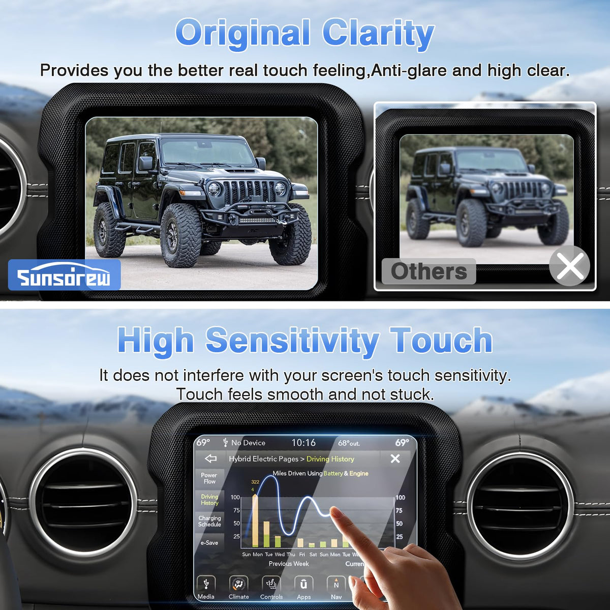 ?Fit Perfectly Wrangler Jl 8.4'?-Sunsdrew 2Pcs Screen Protector Specialized For 2018 2019 2020 2021 2022 Wrangler Jl/2020 2021 2022 Gladiator Jt 8.4-Inch Touch Display Screen.Sunsdrew Screen Protector Uses Advanced Technology And Laser Cutting To Fit Perfectly On The Original Device Screen.Please Check Your Touchscreen Size Before Purchasing. | ?Clear&Anti-Glare?-Installing Our Protective Film Does Not Affect The Gps Display'S Color, Icon Size And Touch Screen Functionality. Screen Still Legible Even Wearing Sunglasses. Viewing The Screen Will Not Reflect Light, And Daily Driving Will Not Be Troubled By Glare, The Probability Of Accident Happenings Will Be Greatly Reduced. | ?Scratch-Protection?-Made Of 9H Hardness Tempered Glass, Providing Your Dashboard Panel Maximum Coverage, Protects Your Screen From Scratches, Scrapes And Impact From Minor Shock. Ordinary Daily Collisions Will Not Cause Damage To Your Screen, Won'T Break Easily. | ?Fingerprint Resistant?-The Hydrophobic And Oleophobic Layer Reduces Sweat Residue And Fingerprints, Keeping Your Screen Pristine All Day Long. It Does Not Interfere With Your Screen'S Touch Sensitivity. Touch Feels Smooth And Not Stuck. | ?Easy To Install&Remove?-Give The Screen One More Good Wiping To Get Dust Off, Pull Off The Backing, Then Drop The Screen Protector On. Just Take About 18 Minutes To Make Your Center Control Navigation Screen Much More Crisp, Clear And Have Brighter Coloring.