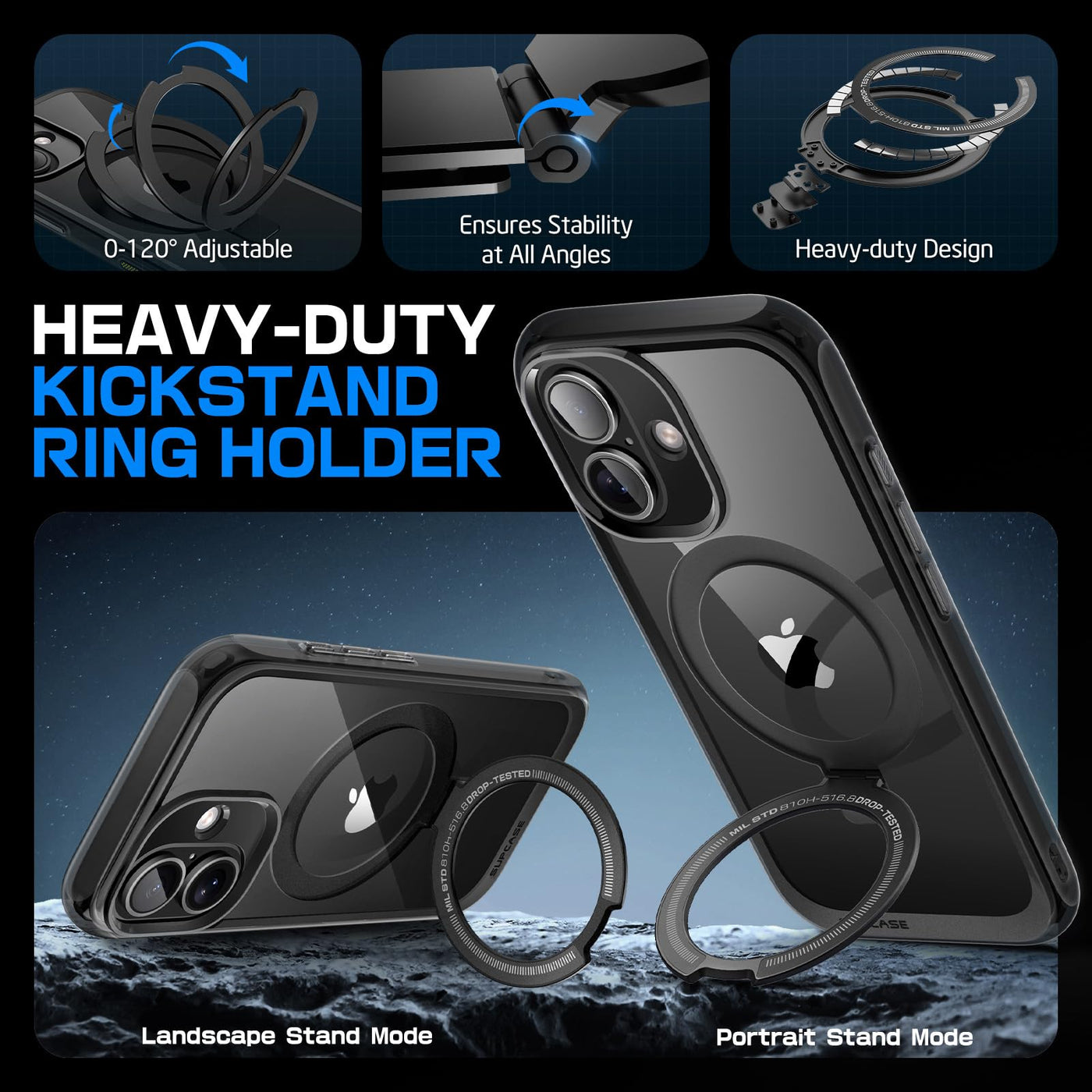 Q: How does the built-in kickstand work?A: The built-in aluminum alloy kickstand allows for multiple viewing angles, making it convenient for watching videos or video calls. It also doubles as a ring holder for added functionality.