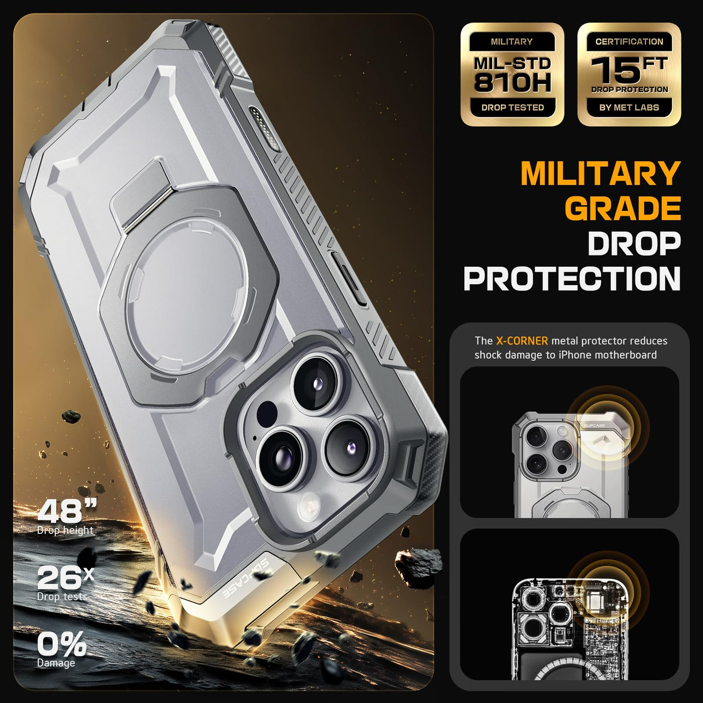 Q: What level of protection does this case provide?A: This case offers 15FT drop protection, utilizing a dual-layer system and four-corner airbag technology to meet rigorous US military-grade standards for shock absorption.