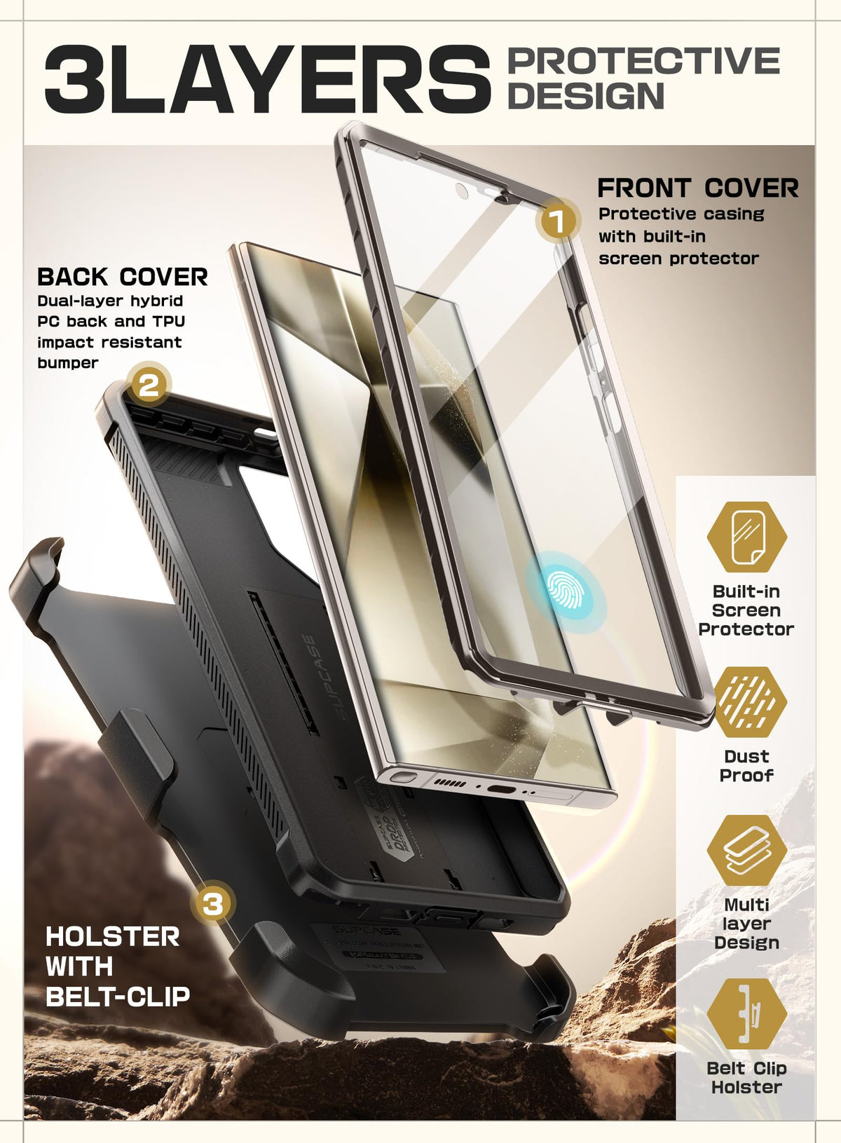 Q: What are the standout features of the SUPCASE Unicorn Beetle Pro Case for Samsung Galaxy S24 Ultra?A: The SUPCASE Unicorn Beetle Pro Case features a robust design with 360° full-body protection, including a detachable rotating belt-clip, two extra front frames for customization, precise cutouts for easy access to all ports and buttons, and multi-layered TPU and Polycarbonate materials that have been drop tested from heights of 20 feet.