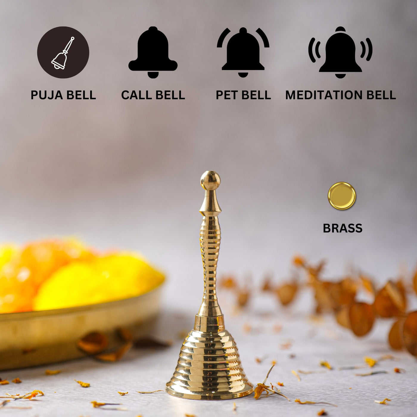Discover The Versatile Elegance Of This Beautifully Crafted Brass Hand Bell, Perfect For Multiple Uses Including Meditation, Prayer Ceremonies, And As A Call Bell. The Exquisite Ribbed Pattern On Its Conical Body And Graceful Handle Creates A Striking Aesthetic, While The Polished Brass Construction Ensures A Clear, Resonant Sound. This Multi-Purpose Bell Serves Wonderfully As A Traditional Pooja Bell For Spiritual Ceremonies, A Meditation Aid For Mindfulness Practices, Or A Practical Call Bell For Home Care Settings. The Durable Brass Construction Provides A Timeless Appeal And Lasting Performance. The Bell'S Thoughtful Design Features A Comfortable Grip And Balanced Weight For Easy Handling. Its Classic Golden Finish Adds A Touch Of Sophistication To Any Setting, Whether Placed On An Altar, Meditation Space, Or Bedside Table. The Bell Produces A Pleasant, Harmonious Tone That Can Effectively Signal Attention Or Mark The Beginning And End Of Meditation Sessions.