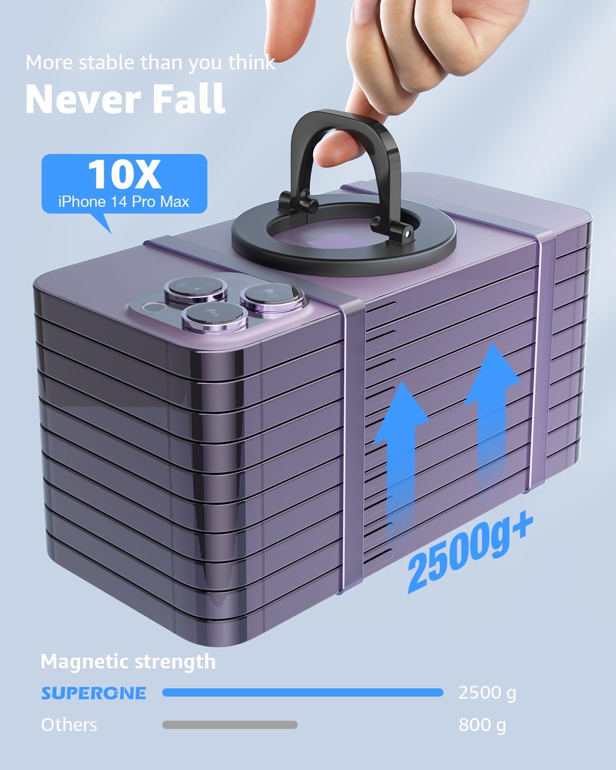 Q: How does the magnetic strength of the phone grip affect its functionality?A: The SUPERONE phone grip features a powerful magnetic force of 88.18 ounces (2500g), which securely holds your iPhone in place. This ensures stability while using your phone as a kickstand or grip, making it reliable for everyday use.