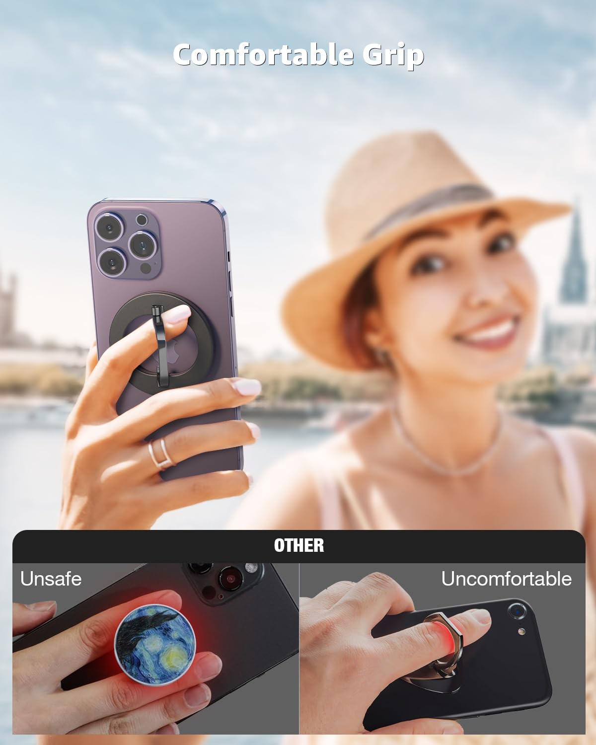 Q: What are the ergonomic features of the phone grip?A: The ergonomic design of the SUPERONE phone grip includes an inner ring that conforms to ergonomic principles. This ensures a comfortable and secure grip, preventing any discomfort or scratches on your fingers during use.