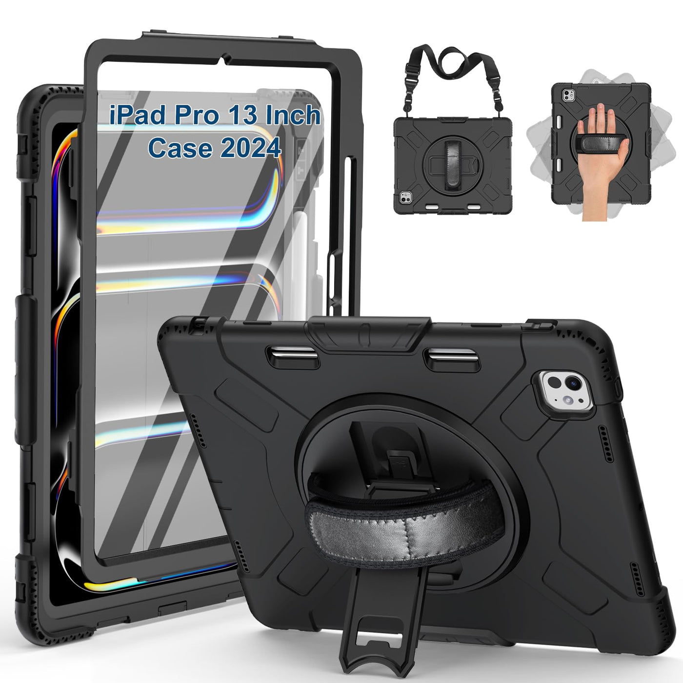 Supfives Case For Ipad Pro 13 Inch 2024 (7Th Gen), With Screen Protector/Shoulder Strap/Pencil Holder/Handle/Rotating Stand, Bla