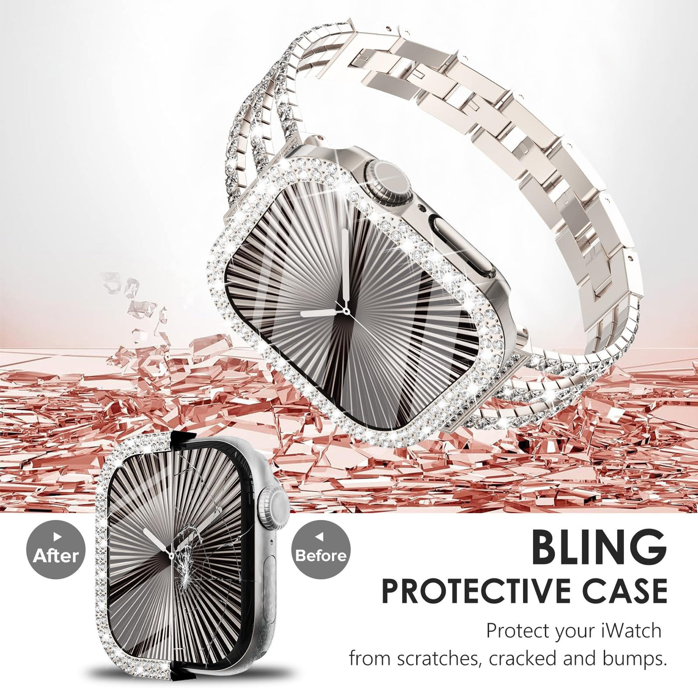 Bling Apple Watch Case With Tempered Glass Screen Protector Only Compatible For Apple Watch Series 10 46Mm; Switch Up The Look Of Your Apple Watch 10 To Match Clothing Or Jewelry Easily And Quickly | Double Cubic Zirconia Halo: Apple Watch Cover Adorned With Over 150 Cubic Zirconia Crystals, Perfect For Upgrading A Casual Outfit Or Complementing A Luxurious Evening Look, It Allows Your Watch To Double As A Handy Gadget And Glamorous Jewelry | Tempered Glass Screen Protector: Its Tempered Glass Shield Is Made From The Same Protective Film Material Used To Military Aircrafts; Full Cover Protective Case Provides Daily Protection Against Scratches And Reduce Chances Of Damage To Your Screen From Impact Forces And Drops | Sensitive Touch: Only 0.1 Mm Thickness Cover Maintains Apple Watch'S Original Response Sensitivity, Ensuring Quick App Launching; Apple Watch Case Snap Onto Your Device Simply, Buttons Are Easy To Touch. No Need To Take Off The Case When Charging The Watch | 18 Months Warranty For A Refund Or Replacement Without Return. Order Your Apple Watch Series 10 46Mm Case With Absolute Confidence