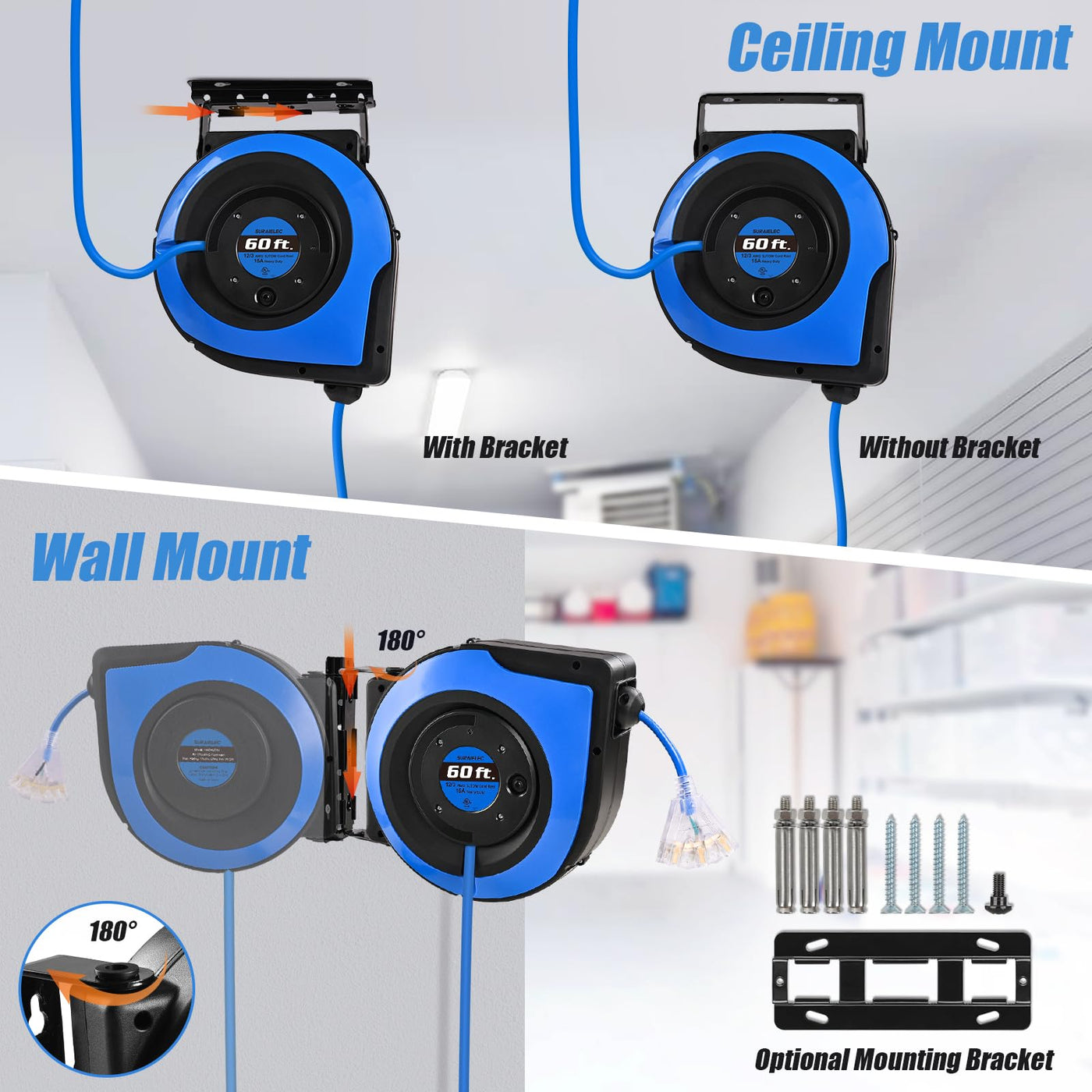 12 Gauge 3 Outlets Heavy Duty Electric Extension Cord Reelquality 12 Awg Cord Reel Is Made Of High-Quality Polypropylene Makes It Impact Resistant And Convenient In Any Workspace.This Extension Cord Reel Rated At 15A/1875W That More Suits Professionals Or Those Who Need To Connect Heavy Machines Such As Table Saws And Major Commercial Tools That Will Need A 12-Gauge Cord To Achieve Full Power.The Illuminated 3 Electrical Outlets Pigtail Can Run Multiple Devices At The Same Time. Led Light Indicates When Power Is On.The Heavy-Duty Built Makes It An Excellent Choice For Any Garage Or Workshop. Ul Listed.15 Amp Circuit Breaker Reset Buttonthe Retractable Extension Cord Reel Comes With A Built-In 15A Circuit Breaker That Keeps Your Electric Appliances Safe From Tripping Or Overloading And Protects Your Expensive Machinery From Any Unfortunate Damage.Durable, Flexible, And Secure Sjtow Power Cordfree Of Alkaline, Acid, Kink, Or Ozone; Water/Oil Resistant And Also Flame Retardant. Sjtow Cord Is Covered With A Vinyl Coating That Makes It Safe From Abrasion Or Bending.60 Ft Power Cable + 4.5 Ft Outlet Connectorwith 60 Feet Long Cord, You Will Always Have Enough Cord For Handling Your Various Devices Efficiently, A Great Option That Brings Power To Where You Need It.4.5 Feet Outlet Connector Is Convenient For Mounting In A Wide Range Of Places.Automatically Retractablethis Wall Or Ceiling Mounted Cord Reel Come With An Automatically Latching And Rewinding System Which Locks The Cord Easily Allowing You To Get As Much Length As Required, Or Just Need A Little Tug To Send The Cord Back Into Its Housing Immediately; Keeps Your Space Clean And No Loose Cords Are Hanging Around.The Electrical Cord Reel Also Has An Adjustable Stopper Which Helps To Leave The Desired Length Of Cord Out.180 Swivel Mounting Bracketwith A Slide Bracket, You Can Easily Mount It On The Wall Or Hang It On The Ceiling To Avoid Clutter.