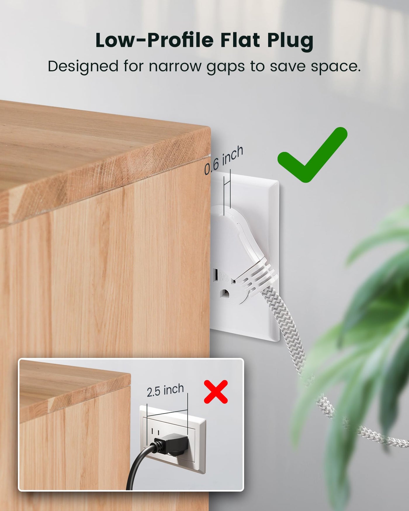 Our Extension Cord Features A 360 Rotating Plug (Only 0.6 Inches Thick) That Allows You To Adjust The Angle For Easy Access To Various Wall Sockets. Ideal For Tight Spaces, It Ensures Convenient Connections From Any Direction, Making It Perfect For Use Behind Furniture Or In Awkwardly Positioned Outlets. The 6Ft Length Includes 3 Grounded Outlets, Enabling You To Power Multiple Devices Simultaneously. Built With 16/3C Gauge Wire, It Delivers 13A At 125Vac And 1625W, Effectively Meeting All Your Power Needs For Household Appliances. This Makes It An Excellent Choice For Powering Everything From Computers And Lamps To Kitchen Appliances And Gaming Consoles. Featuring A Durable Flat Braided Cable, This Extension Cord Incorporates Spt Insulation And A Braided Cover, Providing Superior Wear Resistance Compared To Ordinary Plastic Cords. Its Durable And Flexible Design Allows It To Fit Easily Beneath Carpets, Maintaining A Neat And Tidy Appearance While Reducing Tripping Hazards. The Space-Saving Flat Plug Design Ensures That The Cord Fits Easily In Tight Spaces And Behind Furniture, Helping To Keep Your Home Organized And Clutter-Free. This Thoughtful Design Maximizes Your Available Space, Allowing You To Utilize Outlets More Effectively Without The Hassle Of Bulky Plugs. Etl-Certified, This 3-Prong Extension Cord Provides Multiple Outlets For Your Home Appliances, Including Microwaves, Laptops, Switches, Lamps, Holiday Decorations, And Other Indoor Devices, Giving You Peace Of Mind With Reliable Power Distribution.